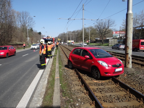 Profesionální hasiči (HZS MSK) z Ostravy-Zábřehu zasahovali v pondělí 9.4.2017 dopoledne u nehody tří osobních aut v ostravské čtvrti Hulváky ve čtyřproudé Plzeňské ulici. Červenou Toyotu Yaris musel vytáhnout z tramvajových kolejí nedaleko zastávky Střelnice jejich vyprošťovací speciál Bizon.             Nehoda, která se stala kolem 11. hodiny dopolední, se obešla bez zranění, ale vyprošťování na několik desítek minut zastavilo tramvajovou dopravu ve směru na Hrabůvku a silniční dopravu svedlo do jednoho pruhu, což vyvolalo dlouhou kolonu. Zvláště řidiči nákladních automobilů museli prokázat svůj um při projíždění mezi Bizonem a železničním mostem, částečně po chodníku. Žádná další nehoda se zde už ale nestala.             Díky tomuto řešení byla silniční doprava ve směru od frekventované křižovatky Plzeňská a 28. října zcela zastavena jen na 4 minuty při příjezdu a ustavení Bizona, a byly tak minimalizovány dopravní problémy.             Po položení toyoty hydraulickou rukou Bizona na kola na silnici hasiči asistovali při jejím nakládání na vozidlo odtahové služby. Také odtlačili druhé havarované auto – Hyundai Tucson – na trávník u silnice. Třetí havarované vozidlo bylo schopno odjet po „svých“ (kolech).             Hasiči ze stanice HZS Moravskoslezského kraje Ostrava-Zábřeh místo nehody několikrát uklízeli od střepů i provozních kapalin, na jejichž únik použili nasákavý sorbent. Zdroj: Petr Kůdela, tiskový mluvčí - HZS Moravskoslezského kraje Foto: HZS Moravskoslezského kraje