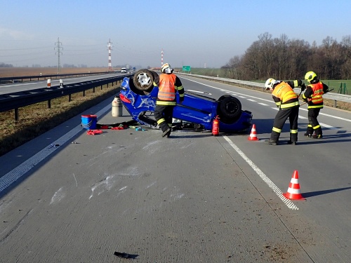 Dvě jednotky hasičů zasahovaly v sobotu 7.4.2018 ráno u nehody osobního automobilu Peugeot 206 na dálnici D1 u Bílova (okres Nový Jičín). Hasiči nejprve uzavřeli dálnici ve směru na Brno, poskytli 4 lehce zraněným předlékařskou pomoc, zalepili proraženou palivovou nádrž tmelem a otočili vlastníma rukama peugeot ze střechy na kola.             Operační středisko hasičů bylo o nehodě informováno v sobotu po půl osmé ranní. Na dálniční úsek do Bílova (km 335, směr Brno) vyjela jednotka Hasičského záchranného sboru Moravskoslezského kraje (HZS MSK) ze stanice Bílovec a jednotka dobrovolných hasičů Studénka.             Všichni čtyři cestující byli při příjezdu hasičů mimo havarovaný peugeot, který ležel na střeše napříč dálnicí. Hasiči jim poskytli předlékařskou první pomoc - do příjezdu ZZS MSK. Peugeot zabezpečili před případným požárem.             V první fázi zásahu hasiči zcela uzavřeli dálnici ve směru na Brno, po odjezdu sanitek byl uvolněn pravý jízdní pruh, který hasiči předtím zametli, protože byl hlavně plný střepů z roztříštěných oken peugeotu. (Úklid levého pruhu si posléze vzala na starost Správa silnic Moravskoslezského kraje a pak byl také zprovozněn.)             Havarované auto mělo v nádrži zapíchnutý kovový patník (ten s odrazkami). Otvor hasiči zatmelili, aby po převrácení zpět na kola - silnými pažemi zasahujících hasičů - neunikal benzín. Ještě pomohli s jeho naložením na vozidlo odtahové služby. Zdroj: Petr Kůdela, tiskový mluvčí - HZS Moravskoslezského kraje Foto: HZS Moravskoslezského kraje FOTOGALERIE