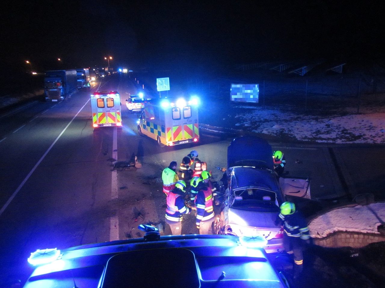 V pondělí, 19.2. 2018, v noci zasahovali profesionální hasiči u nehody nákladního a osobního automobilu u města Napajedla na Zlínsku. Dopravní nehoda nákladního a osobního automobilu na ulici Kvítkovická v Napajedlích, v blízkosti čerpací stanice pohonných hmot, byla hasičům oznámena 19.2.2018 v 20:47 hodin. Oznamovatel operačnímu důstojníkovi hasičů sdělil, že jedna osoba je zaklíněná v osobním vozidle a druhá leží před osobním automobilem. K nehodě byli vysláni profesionální hasiči z centrální požární stanice Zlín a z požární stanice Otrokovice. Průzkumem hasiči zjistili, že řidič osobního automobilu už je mimo vozidlo a před poškozeným osobním vozem leží těžce zraněná osoba. Hasiči zraněnému poskytli předlékařskou pomoc. Zraněnou osobu ponechali až do příjezdu zdravotníků ve stabilizované poloze. Obě zraněné osoby byly později převezeny do nemocnice. Hasiči provedli protipožární opatření. V průběhu záchranných prací a vyšetřování nehody byla silnice I/55 od 21:08 hodin oboustranně uzavřena. Hasiči pro účely šetření osvětlovali místo nehody. Silnice byla zprůjezdněna v obou směrech v 23:44 hodin. Hasiči dále asistovali při nakládání poškozeného automobilu na vůz odtahové služby. Po úklidu silnice se vrátili zpět na stanici. Zdroj: nprap. Roman Žemlička – HZS Zlínského kraje Foto: HZS Zlínského kraje