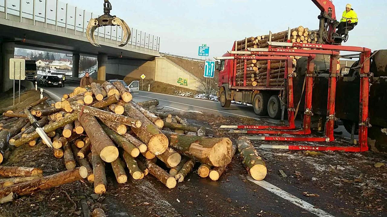 Převracený přívěs se dřevem zcela zablokoval dopravu