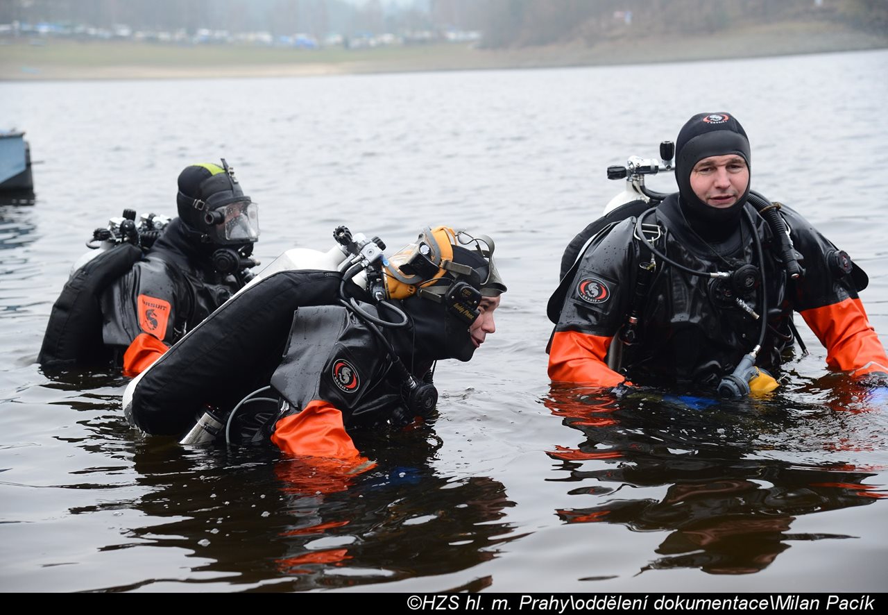 Hlášení o neobvyklé události přijalo operační středisko středočeských hasičů v pátek 26. ledna 2018 krátce před devátou hodinou, když podle ohlašovatele u hráze Orlické přehrady samovolně sjelo do Vltavy osobní auto. K události vyjeli profesionální hasiči z Příbrami, kteří kromě cisternové automobilové stříkačky a vyprošťovacího automobilu vyrazili i s lodním přívěsem, a také jednotka sboru dobrovolných hasičů obce Solenice. Po rychlém průzkumu místa události hasiči zjistili, že vozidlo nesjelo do hlubokých vod přehradní nádrže, ale zůstalo asi deset metrů od břehu a na hladinu prosvítá jeho střecha. Vlastními prostředky však jednotky nebyly schopné vozidlo zachytit a vytáhnout na břeh, proto byli o pomoc požádáni policejní potápěči spolu s potápěčskou skupinou HZS hlavního města Prahy ze stanice Modřany. Do jejich příjezdu nasadili hasiči kolem místa ponoru provizorní sorpční hady, i když na hladině nebyly znatelné stopy po úniku ropných látek. Po příjezdu potápěčů a zmonitorování situace bylo vozidlo nejdříve pomocí speciálních vzduchových vaků přiblíženo k hladině. Následně bylo pozvolna odtlačeno k lodnímu výtahu, na který pak bylo naloženo a vytaženo na břeh. Zpátky na pevnou zem pomohli vozidlu příbramští hasiči jeřábem vyprošťovacího automobilu. Vzhledem k tomu, že se v autě nikdo nenacházel, skončila celá událost po vzoru Františka Koudelky z STS Chvojkovice Brod pouhým „odbahněním a vysušením“. FOTO: HZS hl. města Prahy Zdroj: por. Ing. Ladislav Holomčík, tiskový odbor HZS Středočeského kraje Foto:HZS Středočeského kraje FOTOGALERIE