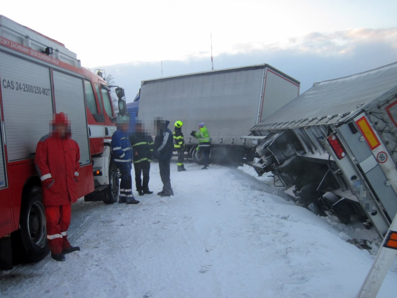 Ve čtvrtek 18. 1. 2018 vyjížděli k dopravní nehodě nedaleko obce Loučka na Vsetínsku hasiči krátce před čtvrtou hodinou odpolední. Podle oznamovatele zde došlo k převrácení kamionu, který zasahoval do železnice. Operačním střediskem byl proto okamžitě vyhlášen poplach jednotce profesionálních hasičů ze stanice Valašské Meziříčí a jednotce hasičů SŽDC z Přerova.  Jako první na místo dorazili profesionální hasiči, kteří upřesnili, že zde došlo k převrácení prázdného přívěsu nákladního automobilu značky MAN. Ten zůstal částečně na komunikaci a jeho přívěs zasahoval do kolejiště. Železniční provoz v tomto úseku byl proto úplně zastaven a komunikace II. třídy číslo 150 mezi Kunovicemi a Loučkou byla v době řešení nehody také uzavřena. Řidič při nehodě neutrpěl žádná zranění a nebyl potvrzen ani únik provozních náplní vozu. Po provedení průzkumu a zhodnocení situace si velitel na místo povolal posilovou jednotku dobrovolných hasičů obce Kunovice a byl využit také nabídnutý zemědělský traktor jednoho z místních občanů. Práci všem zasahujícím na místě komplikoval velmi silný vítr. Po ustavení techniky byl prázdný přívěs převrácen zpět na kola a zajištěn proti dalšímu pohybu. Celá souprava byla pak postupně technikou hasičů vytažena zpět na komunikaci. Po jejím vyproštění a vyloučení dalšího nebezpečí byla v 17:32 hodin komunikace i železnice opět průjezdná a zásah jednotek byl na místě ukončen. Zdroj: kpt. Ing. Pavel Řezníček – HZS Zlínského kraje, Foto: HZS Zlínského kraje FOTOGALERIE