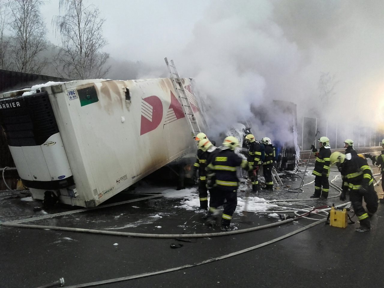 V neděli 7. ledna j2018 jedenáct minut před sedmou hodinou ranní byl středočeským hasičům nahlášen požár návěsu kamionu na kilometru 9,5 plzeňské dálnice D5 ve směru do Prahy.  Na místo vyjela jednotka profesionálních hasičů ze stanice Beroun a dobrovolní hasiči z obce Rudná. Řidič soupravy byl velmi pohotový a podařilo se mu před rozšířením požáru odpojit tahač od návěsu. Následně informoval hasiče, že se uvnitř návěsu nacházejí dvě dvoukilogramové propanbutanové tlakové lahve. Vozidlo převáželo potraviny v polotovaru (klasy kukuřice) na paletách. Při příjezdu první jednotky byl požár rozšířen na celý návěs. Hasiči použili k zásahu těžkou pěnu. Velitel zásahu na místo povolal ještě jednu velkoobjemovou cisternu dobrovolných hasičů z Chyňavy. Požár byl pod kontrolou za 23 minut od zahájení zásahu a probíhalo dohašování hořícího nákladu uvnitř návěsu. Pro zefektivnění zásahu byla na místo vyžádána speciální technika ze Záchranného útvaru HZS ČR ze Zbirohu, konkrétně nákladní automobil a teleskopický manipulátor. Po dojezdu zbirožské jednotky začalo postupné vykládání palet a dohašování skrytých ohnisek. Na místo byl vyslán také protiplynový automobil ze stanice Kladno, který zajistil výměnu tlakových lahví k dýchacím přístrojům. Likvidaci požáru ohlásil velitel zásahu operačnímu středisku v 16 hodin. Po celou dobu byla dálnice ve směru do Prahy uzavřena a policie odkláněla provoz od exitu 10 Loděnice k exitu 5 Rudná po staré plzeňské silnici. Celková škoda byla vyčíslena na 1 milion korun, kromě návěsu a převáženého zboží požár poškodil také dřevěnou protihlukovou stěnu na okraji dálnice. Jako příčinu požáru vyšetřovatel stanovil vznícení pneumatiky po defektu. Zdroj: kpt. Ing. Jaroslav Gabriel – tiskový odbor HZS Středočeského kraje Foto:HZS Středočeského kraje FOTOGALERIE