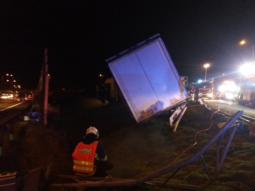 V pondělí, 18. prosinec 2017, jednotky hasičů Jihomoravského kraje zasahovaly u nehody kamionu na dálničním sjezdu D1 na 190. km ve směru na Prahu. Řidiče bylo nutné vyprostit. Následovalo zajištění návěsu a opatření související s únikem nafty do vodoteče.  Dálnice D1 zůstala po nehodě průjezdná. Přesto se vytvořila mnohakilometrová kolona, ve které řidiči opět nedokázali vytvořit záchrannou uličku. Opakovaně proto apelujeme na řidiče, aby při příjezdu do kolony nechali mezi pruhy min. 3 metry širokou uličku a především ji po průjezdu zasahujících složek opět neuzavírali, což byl i dnešní případ. Stejně tak platí, že uličku je nutné vytvořit již při příjezdu do kolony. Vytváření uličky až v době příjezdu zásahových vozidel značně zdržuje a komplikuje cestu na místo, kde jsme potřeba, říká tiskový mluvčí HZS Jihomoravského kraje Jaroslav Mikoško. U nehody zasahovaly hasičské jednotky ze stanic BVV, Starý Lískovec, Lidická, Líšeň a dobrovolní hasiči ze Starého Lískovce.  Po příjezdu hasičů krátce před 16. hodinou bylo prvořadým úkolem zajistit vyproštění zraněného řidiče zahraničního kamionu.  To se podařilo bez použití hydraulického vyprošťovacího zařízení. Dále bylo nutné zajistit návěs kamionu proti převrácení. Souprava totiž zůstala po nehodě mimo dálnici ve svahu nad vodotečí mezi dálničním sjezdem a tělesem dálnice. Hasiči zjistili, že nehodou došlo k poškození nádrže a do půdy a vodoteče uniklo přibližně 350 litrů nafty. Velitel zásahu rozhodl o jímání uniklé nafty ve vodoteči a to na obou stranách dálnice. Na místo přijela také pracovnice odboru životního prostředí pro konzultaci následného postupu likvidace nafty. Po půl sedmé byla vodoteč po propláchnutí vodou a sběru kontaminovaného sorbentu čistá. Překládku nákladu kamionu a jeho vyproštění bude v následujících hodinách řešit specializovaná firma. Hasičské jednotky ukončily činnost na místě zásahu krátce po 19. hodině.  Sjezd na 190. kilometru byl v době odjezdu jednotek stále uzavřen. Zdroj: Jaroslav Mikoška firebrno.cz Foto: HZS Jihomoravského kraje FOTOGALERIE