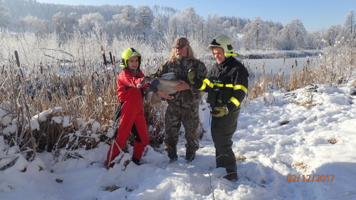 Třikrát vyjížděli profesionální hasiči z Moravskoslezského kraje (HZS MSK) během posledních sedmi dní od 2.prosince do 8.prosince 2017 k záchranám celkem čtyř tvorů: - do Rýmařova-Jamartic  na zamrzlý rybník pomoci mladé pochroumané labuti, - do Bruntálu do budovy pozemkového úřadu osvobodit dvě mrštné kuny - do Ostravy-Polanky nad Odrou vyprostit bernského salašnického psa Ervína z plotu. Všechny tři zásahy byly úspěšné a obešly se bez zranění tvorů i hasičů.             V sobotu 2.12.2017 dopoledne vyjela jednotka Hasičského záchranného boru Moravskoslezského kraje (HZS MSK) Rýmařov do okrajových Jamartic opatrně chytit odrostlejší labutí mládě, zřejmě zraněné, které neodletělo společně se svými vrstevníky, byť nebylo přimrzlé.             Labuť se ukrývala v rákosí na okraji tůně, hasiči ji bez větších problémů chytili a odnesli na břeh. O pomoc je požádal zástupce Záchranné stanice dravců a sov Stránské, který také od zasahujících hasičů labuť převzal a odvezl ve velkém pytli do tepla záchranné stanice.             Jednotka HZS MSK ze stanice Bruntál vyjela ve středu 6.12.2017 ráno do centra města, a to do budovy bruntálské pobočky Krajského pozemkového úřadu pro Moravskoslezský kraj, kde v odvětrávací šachtě, hluboké asi 4 metry, uvízly dvě kuny skalní. Hasiči je odchytili v úzkém profilu pomocí deky a umístili do speciální klece, kterou poskytla Městská policie Bruntál. Pak klec hasiči odvezli a kuny vypustili do volné přírody na okraji města.             V pátek 8.12.2017 dopoledne vyjela jednotka HZS MSK Ostrava-Zábřeh do okrajové ostravské části Polanka nad Odrou, kde se krásný bernský salašnický pes, slyšící na jméno Ervín, zasekl v kovovém plotním pletivu. Hasiči pletivo uvolnili pákovými nůžkami a zaseknutou hlavu opatrně vytáhli. Pes pak kolem nich spokojeně poskakoval a nechal se pohladit, pokud právě dostal od hasičů laskominu. Tu rozdávali spokojení majitelé psa. 1. 2. 3. Zdroj: Petr Kůdela, tiskový mluvčí - HZS Moravskoslezského kraje Foto: HZS Moravskoslezského kraj