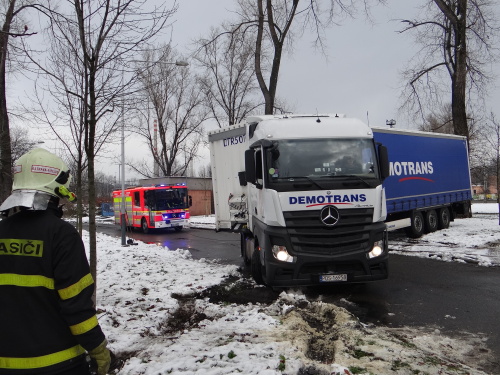 Dvě jednotky profesionálních hasičů (HZS MSK) zasahovaly v pondělí 4.12.2017 přes poledne u nehody polského kamionu Mercedes Actros, který při odbočování vedle myší díry v Ostravě-Přívoze urazil se stupačkou i kus palivové nádrže. Asi sto metrů od místa nárazu do betonu se marně snažil otočit a uvízl v zasněžené trávě. Do ní uniklo kolem 50 litrů nafty, hasiči dalších 350 litrů přečerpali do náhradních nádob a nádrž utěsnili.             Operační středisko hasičů bylo v pondělí dopoledne informováno obyvateli bytového domu v Ostravě-Přívoze, že pod okny stojí kamion a uniká z něj nafta. Do Arbesovy ulice vyjely dvě ostravské jednotky Hasičského záchranného sboru Moravskoslezského kraje (HZS MSK) - ze stanic Fifejdy a Zábřeh, včetně chemického vozidla a kontejnerového automobilu se sorbentem.             Polský řidič vzdal boj s kluzkou ostravskou trávou, aniž by si všimnul, že mu pomalu teče z poškozené nádrže. Hasiči natržené místo u stupačky ihned provizorně zalepili a zbytek obsahu nádrže, asi 350 litrů nafty, přečerpali do přivezených nádob. Pak pomocí předního navijáku hasičské cisterny Mercedes Econic polský kamion, naštěstí prázdný, natřikrát potáhli - a byl vysvobozen, tedy zpět na asfaltové silnici.             Místo největšího úniku nafty – pod koly zaklíněného kamionu - hasiči vydatně zasypali nasákavým sorbentem. Místo úniku předali pracovníkovi České inspekce životního prostředí. Polský řidič i jeho kamion skončili v péči Policie ČR. Zdroj: Petr Kůdela, tiskový mluvčí - HZS Moravskoslezského kraje Foto: HZS Moravskoslezského kraje