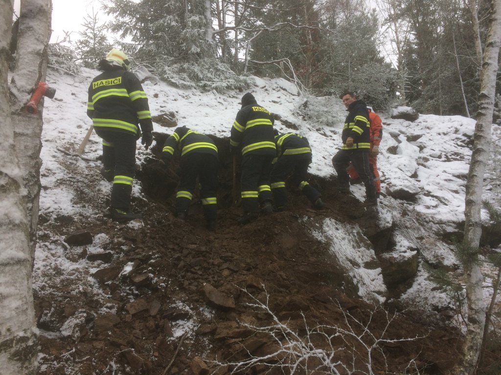 Ve skalách u Bernartic bojuje od včerejšího rána sedm jednotek o život psa. Pes už čtvrtý den strádá hladem a sužují ho nízké teploty na bodě mrazu.