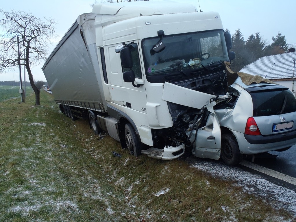 V pondělí 4. prosince 2017 v 8:46 hodin obdrželo operační středisko informaci o dopravní nehodě osobního auta a kamionu, která se stala na hlavní silnici nad Plasy směrem na Kralovice nedaleko odbočky na Žebnici a Babinu v místě zvaném Sokolka. Osobní auto se čelně zaklínilo pod kabinu tahače, jeho řidič ve zdemolované kabině podlehl smrtelnému zranění. Kamion pravou částí sjel ze silnice a návěs se nebezpečně naklonil nad příkop. Řidič kamionu vyvázl s lehkým poraněním. Než hasiči přistoupili k samotnému vyproštění těla, museli počkat, než PČR provede potřebné šetření a kvůli hrozícímu nebezpečí převrácení kamionu do příkopu také na příjezd specializované odtahové služby. Během této doby hasiči odstranili ze zhruba čtyřiceti metrového úseku trosky obou vozidel a rozlité provozní kapaliny. Hasiči asistovali odtahové službě při zajišťování kamionu proti převrácení. Teprve až společnými silami nadzdvihli kabinu kamionu, se jim podařilo osobní auto vytáhnout. Následně vyprostili zemřelého a předali koronerovi k ohledání. Silnice byla po většinu času průjezdná jedním jízdním pruhem. Pouze po dobu vyprošťovacích pracích bylo nutné uzavřít dopravu v obou směrech, uzavírka trvala necelé dvě hodiny. Zdroj: Mgr. Pavla Jakoubková, tisková mluvčí – HZS Plzeňského kraje Foto: HZS Plzeňského kraje