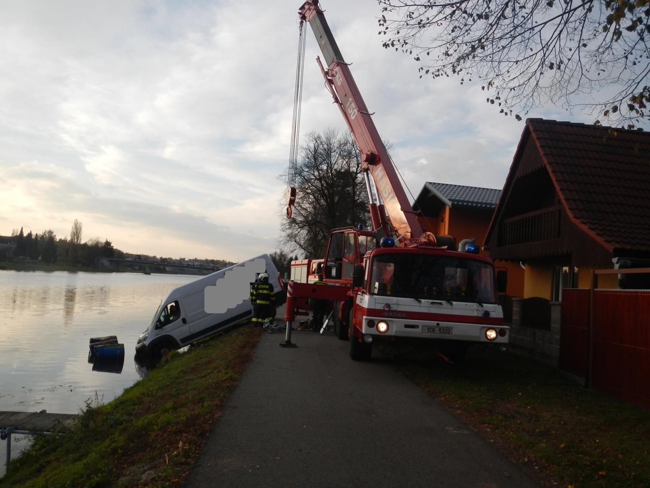 Ve čtvrtek ,2. listopadu 2017, přijalo Operační a informační středisko HZS Jihočeského kraje na tísňovou linku 112 zprávu o nehodě dodávky, která v Týně nad Vltavou na Nábřeží 5. května sjela ze silnice do řeky.  Na místo byla v 14:17 hodin povolána profesionální jednotka ze stanice Týn nad Vltavou, která průzkumem potvrdila tísňové hlášení. Dodávka tovární značky Fiat sjela přední části do řeky, pod hladinou skončila část jejího motorového prostoru. Při sjetí dodávky do řeky bylo poškozeno ocelové plovoucí molo. Z vozidla nebyl patrný únik provozních kapalin. Vozidlo bylo nutné vyprostit z důvodu možného převrácení do řeky a následného ohrožení životního prostředí. Velitel zásahu si jako posilovou jednotku vyžádal automobilový jeřáb ze stanice České Budějovice.  Mezitím týnští hasiči z dodávky vyložili náklad (dřevěná prkna) a částečně odstranili ocelové lešení mola. Po ustavení automobilového jeřábu a zadokumentování nehody Policií ČR hasiči oblečeni do obleků pro práci ve vodě navázali dodávku pomocí speciálních textilních a ocelových prostředků, kladek a navijáku na jeřáb a auto vytáhli zpět na břeh. V průběhu vyprošťování bylo nutné motorovým rozbrusem rozřezat kotvení mola, které bylo později z řeky také vytaženo. Zásah jednotky ukončily před 18. hodinou. Na místě zásahu byl přítomen dále zástupce Povodí Vltavy, a. s. Zdroj: Vendula  Matějů –tisková mluvčí Jihočeský kraj Foto: HZS Jihočeský kraj