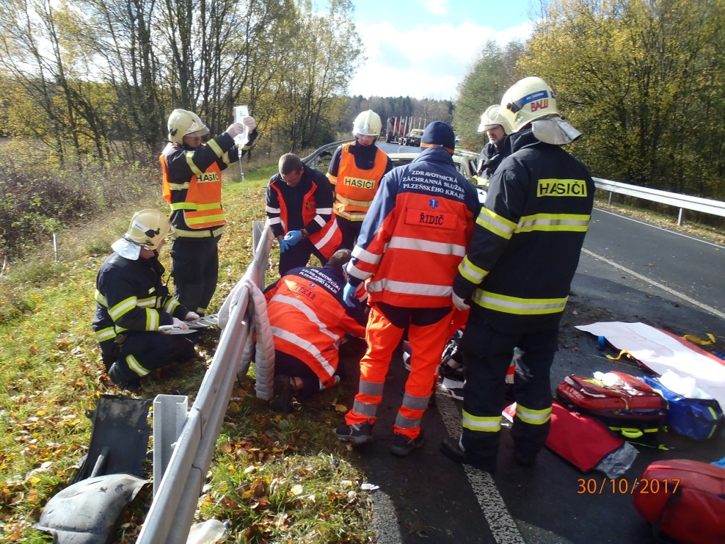 V pondělí 30. října 2017 v 10:23 hodin vyslalo operační středisko hasiče z Tachova a z protisměru dobrovolné hasiče z Plané k dopravní nehodě osobního vozu a nákladního auta na přepravu kulatiny, která se stala v zatáčce poblíž Horního rybníka. V obou vozidlech cestovali pouze řidiči. Řidič nákladního auta vyvázl bez zranění. Řidička osobního auta utrpěla velmi vážná poranění a upadla do bezvědomí. Naštěstí za ní jel v druhém autě její přítel, který ji ze zdemolované kabiny vytáhl a začal bezprostředně po nehodě resuscitovat. Mladík prováděl nepřímou srdeční masáž až do příjezdu záchranných složek. Lékařům se nakonec podařilo mladou ženu zresuscitovat. Hasiči asistovali ZZS při resuscitaci a pomohli řidičku transportovat do vrtulníku LZS. Záchranné týmy se shodly, že šanci přežít dostala dívka především díky tomu, že jí byla poskytnuta laická první pomoc včas. Po odletu vrtulníku hasiči odstranili ze silnice větší množství uniklých provozních kapalin. Znečištěna jimi byla pouze vozovka, do příkopu se žádné ropné látky nedostaly. Odtahové službě pomohli hasiči naložit zdemolované auto včetně trosek, které byly rozházeny po silnici ve vzdálenosti až 100 metrů od místa střetu. Zdroj: Mgr. Pavla Jakoubková, tisková mluvčí – HZS Plzeňského kraje Foto: HZS Plzeňského kraje