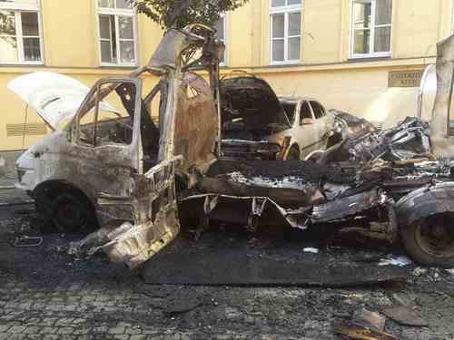 Dnes 28.9. 2017 odpoledne vyjely naše tři jednotky k požáru dodávky ve vnitrobloku v Brně na Moravském náměstí. Výbuch tlakové lahve zcela zničil dodávku a způsobil škody přes milion korun. Dva muži se zranili. Hasiči dorazili na místo do pěti minut. Museli se vypořádat s požárem dodávky a vedle zaparkovaného auta po výbuchu tlakové lahve uvnitř dodávky. Průzkumem objevili další tlakovou lahev s kyslíkem několik metrů od výbuchu. Po jejím ochlazení se zjistilo, že zřejmě následkem výbuchu, došlo k jejímu poškození a vyprázdnění. Během zásahu se předpokládalo, že tlakové láhve jsou součástí svařovací soupravy a v dodávce tedy explodoval acetylen. Po dohašení dodávky a odkrytí roztržené lahve hasiči zjistili, že jde také o kyslíkovou láhev. Při výbuchu se zranili dva muži, které si převzala do péče záchranná služba a po poskytnutí odborné péče je transportovala do nemocnice. Velitel zásahu si na místo povolal automobilový žebřík, ke kontrole střechy přilehlé budovy. Nalezené trosky hasiči pomocí lezecké techniky odstranili. Hasiči na místě zasahovali tři hodiny. Náš vyšetřovatel odhadl, že škoda přesáhne milion korun. Po výbuchu je poškozeno množství oken, fasáda a další zaparkované vozy. Příčina celé události zůstává v šetření. Zdroj: Jaroslav Mikoška firebrno.cz Foto: HZS Jihomoravského kraje