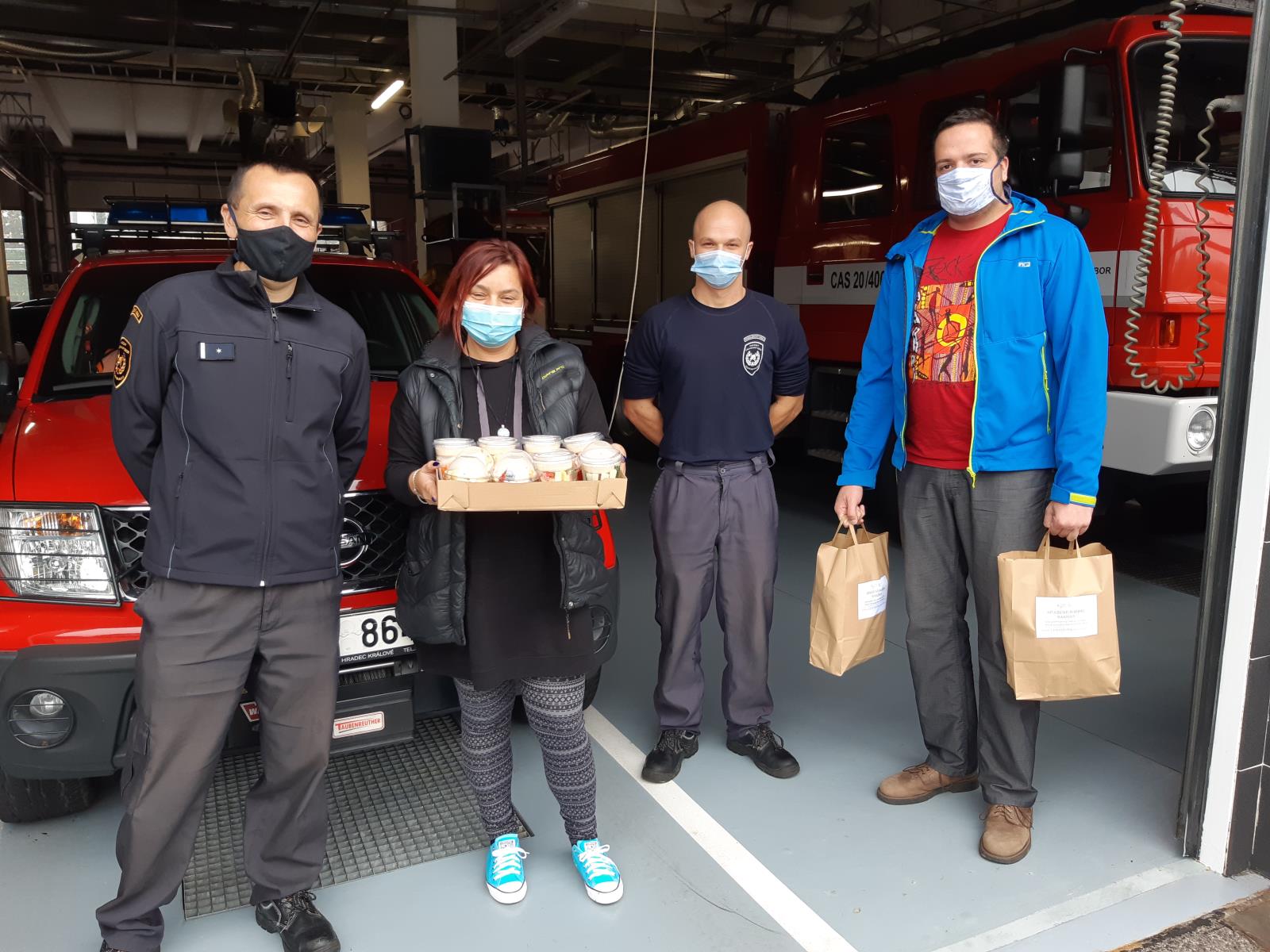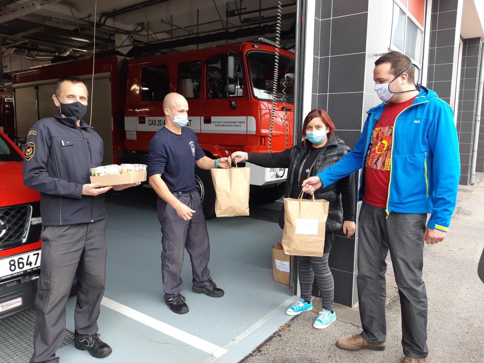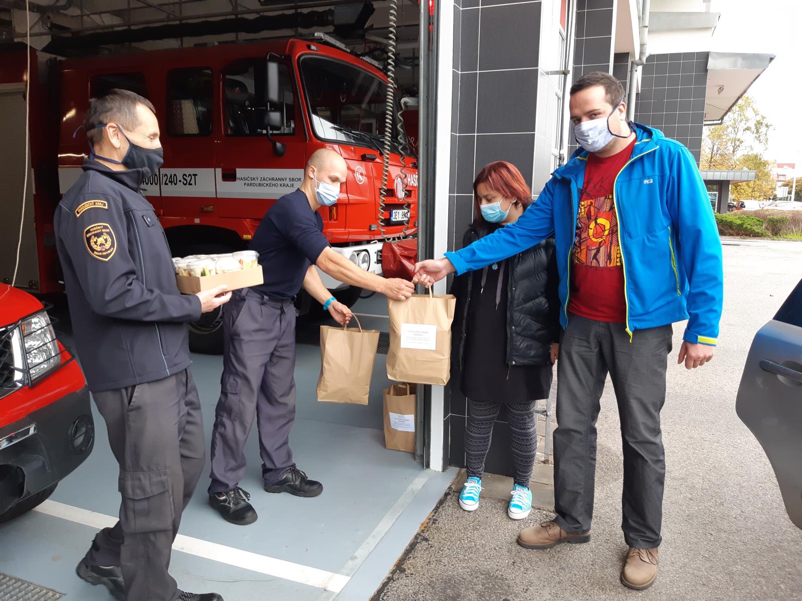 Svačinky si dnes od dvou milých lidí z Centra Kosatec převzali hasiči na stanici v Pardubicích.