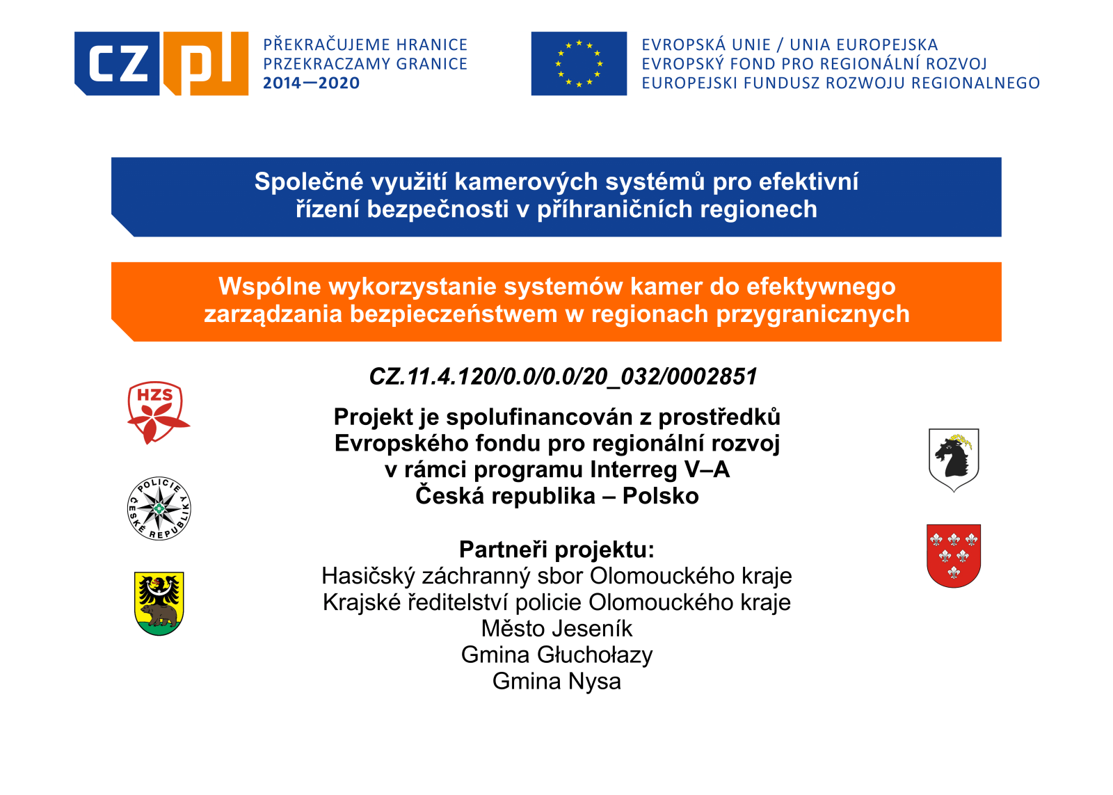 Název projektu: Projekt č. CZ.11.4.120/0.0/0.0/20_032/0002851 Společné využití kamerových systémů pro efektivní řízení bezpečnosti v příhraničních regionech /Wspólne wykorzystanie systemów kamer do efektywnego zarządzania bezpieczeństwem w regionach" je spolufinancovaný z prostředků Evropského fondu pro regionální rozvoj prostřednictvím programu Interreg V-A Česká republika – Polsko.