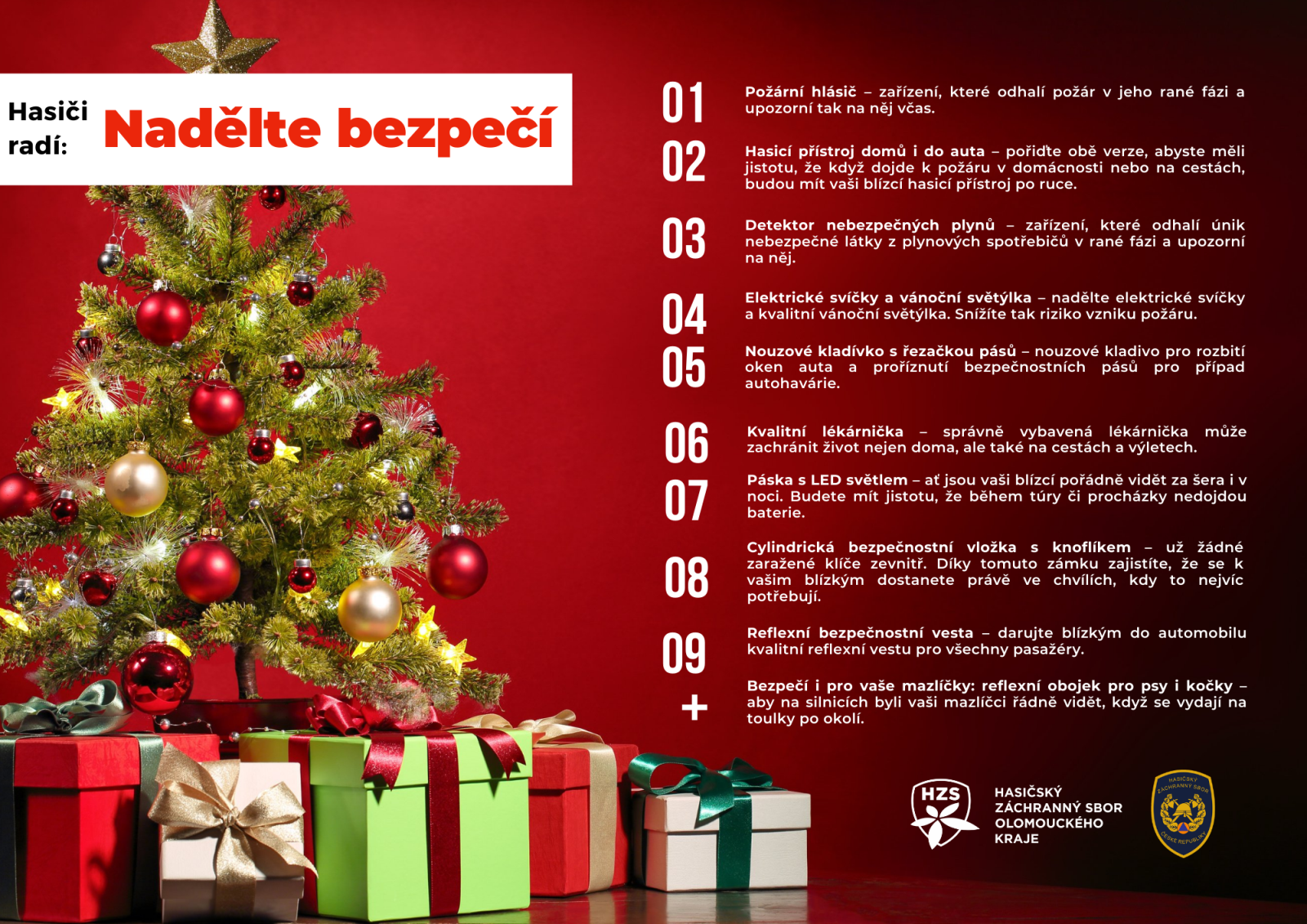 Připravili jsme si pro vás letos odlehčenější variantu našich předvánočních požárně-bezpečnostních rad a rozhodli jsme se vám doporučit, abyste vašim blízkým letos pod stromeček nadělili jednu z nejcennějších komodit. Bezpečí. Pořiďte inteligentní požární hlásič, moderní hasicí přístroj domů nebo do auta či speciální cylindrickou vložkujako zámek do dvěří a zajistěte si tak větší rodinnou pohodu nejen o Vánocích.