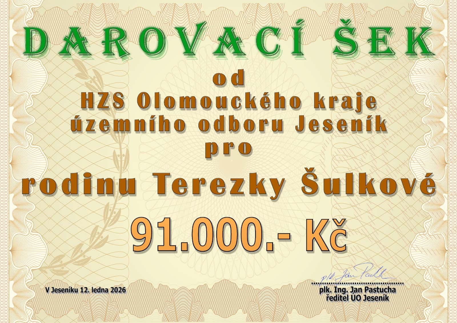 Výtěžek ve výši 91 tisíc korun byl předán přímo na stanici Jeseník do rukou rodičů Terezky. Podle velitele je taková forma pomoci nejúčinnější, protože finance jsou využity tam, kde je to nejvíce potřeba. „Každoročně vybíráme jednu rodinu s konkrétním příběhem. Jsme rádi, že peníze využije dobrovolný hasič na rehabilitace a terapie své dcery,“ doplnil plukovník Pastucha.