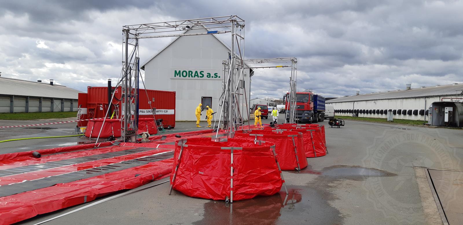 Záchranný útvar HZS ČR obsluhuje zařízení Stanoviště dekontaminace techniky a stanoviště dekontaminace osob. Příslušníci HZS Pardubického kraje společně se zaměstnanci firmy zasahují přímo v ohnisku nákazy.