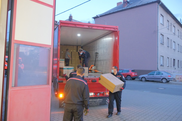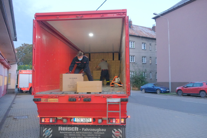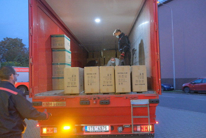Celkem 324 650 kusů respirátorů FFP2 čínské výroby pro pedagogy dovezli v úterý 6.10.2020 večer z centrálního skladu v Pardubicích-Opočínsku profesionální hasiči do „meziskladu“ v bývalé stanici HZS Moravskoslezského kraje v Ostravě-Hrabůvce. Hned ve středu ráno budou krabice – každá obsahuje tisíc kusů respirátorů ve 20 krabičkách – rozvezeny podle předem připraveného rozdělovníku do 22 obcí Moravskoslezského kraje s rozšířenou působností (ORP).