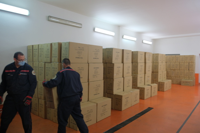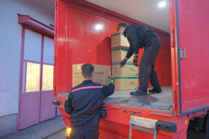 Z Opočínku dovezl hromady krabic extra dlouhý kamion ze Záchranného útvaru HZS ČR v Hlučíně. Pod vedením por. Richarda Dudka z HZS Moravskoslezského kraje jej velmi rychle vyskládali do garáže objektu bývalé stanice HZS MSK Ostrava-Hrabůvka na hromady po 50 krabicích (tedy 50 tisíci kusech) dobrovolní hasiči z Vratimova. Hasiči pro jistotu namátkově zkontrolovali, zda počty respirátorů „sedí“ s deklarovaným počtem na krabici.