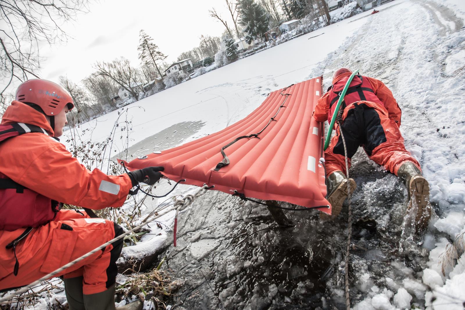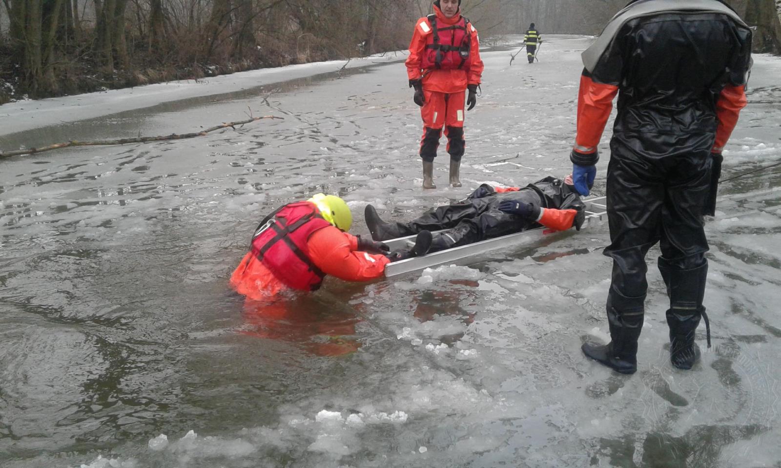 - Při samotné záchraně tonoucích osob z ledové vody po propadnutí je v prvé řadě nutné nejdříve: uvědomit složky IZS (integrovaného záchranného systému) linky 112 nebo 150 a 155. K okraji propadlého ledu se pak přibližujte s ohledem na svoji vlastní bezpečnost velice opatrně, s využitím co největší plochy (plazením, s použití žebříků, desek, klád nebo plavidel) a pokud možno upoutáni na laně s jakýmikoliv i improvizovanými plovacími pomůckami.