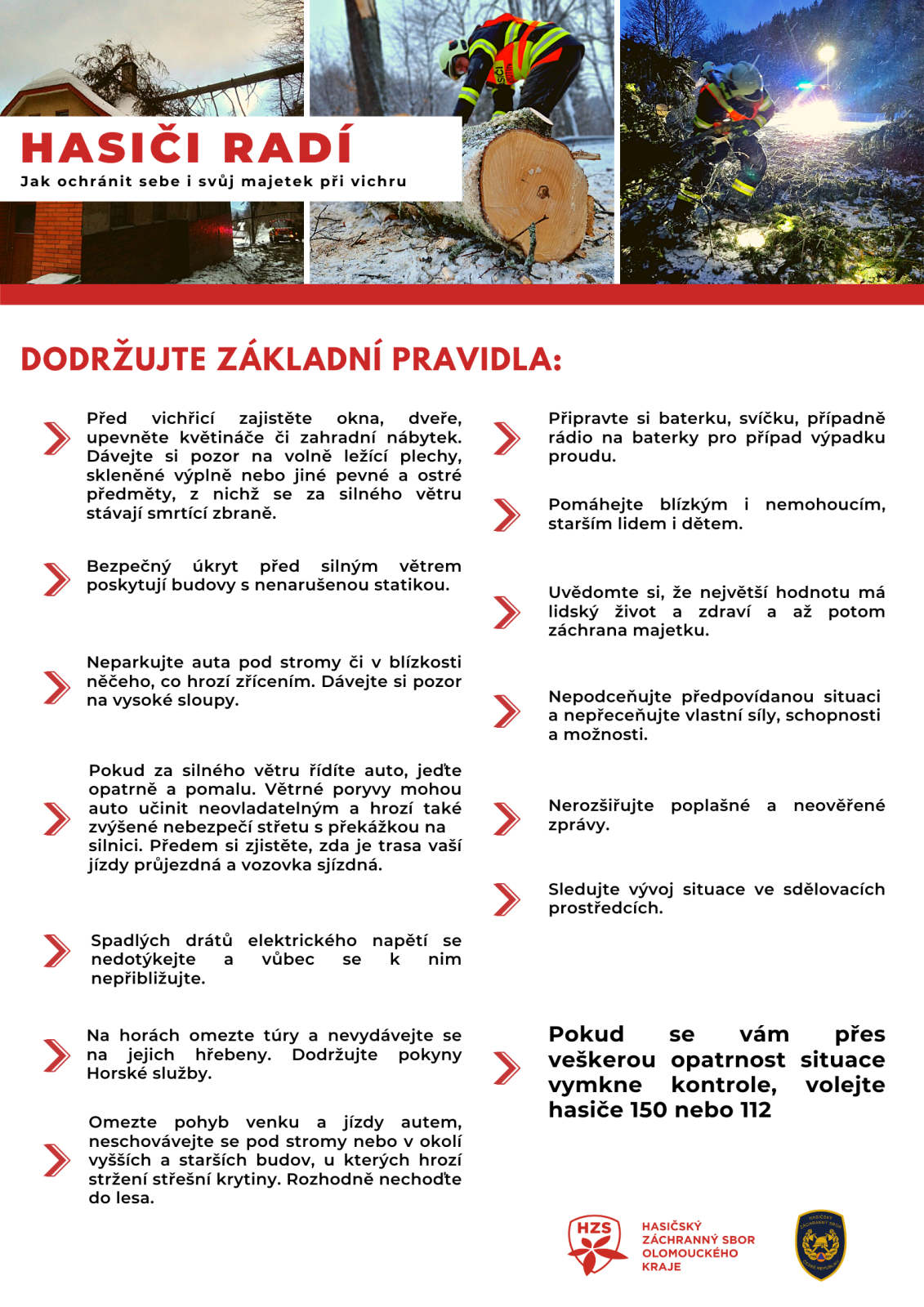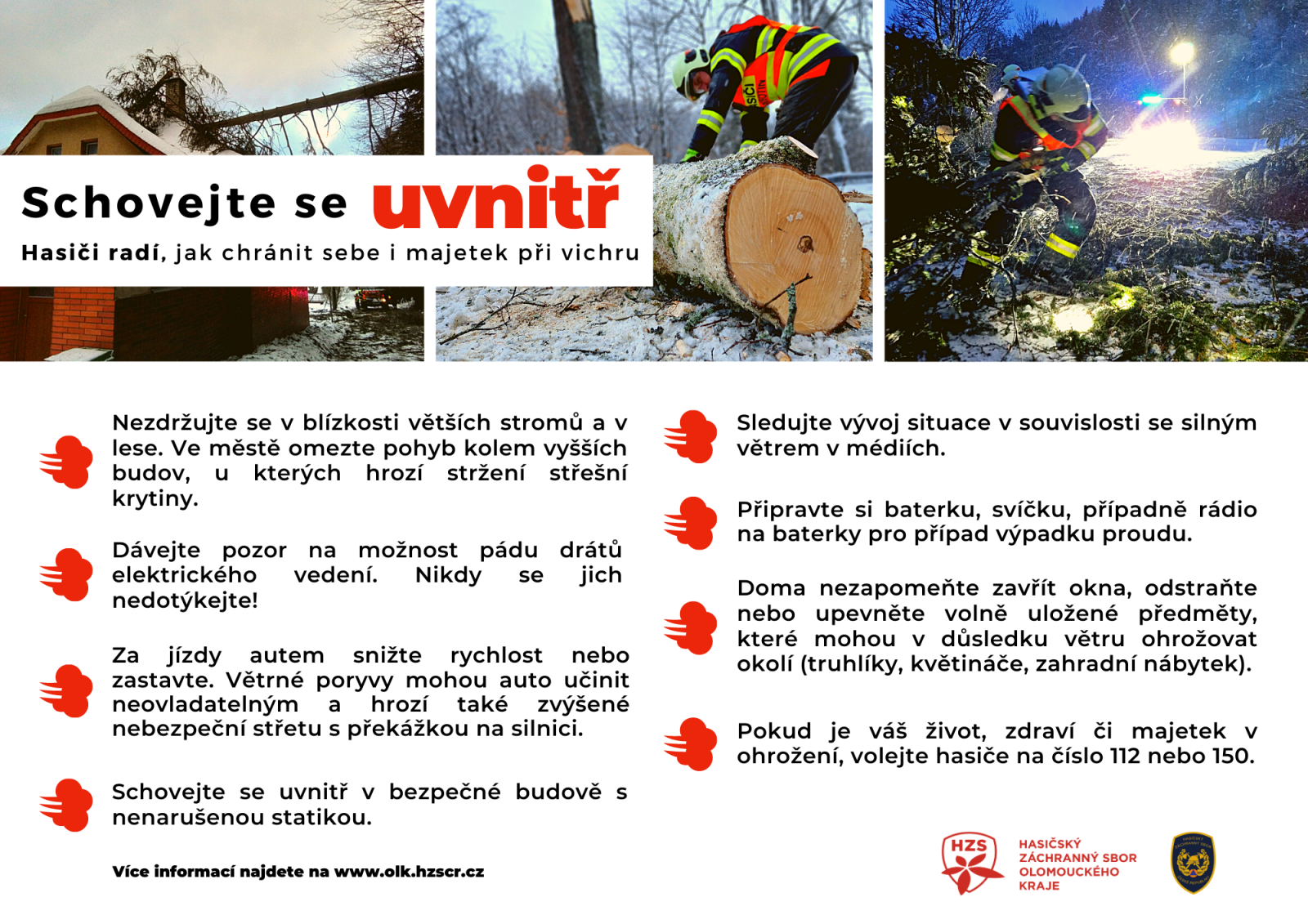 Zimní i jarní měsíce jsou často spojené s velmi větrným počasím. Nárazy větru mohou způsobit velké škody na majetku i na zdraví, jako například v polovině února, kdy jsme při vichřici vyjížděli k téměř 170 událostem v celém v Olomouckém kraji. Spolu s jednotkami dobrovolných hasičů jsme odstraňovali následky silného větru dva dny. Připomeňte si proto s námi základní zásady, abyste při vichru předešli zranění či poškození vašich věcí.