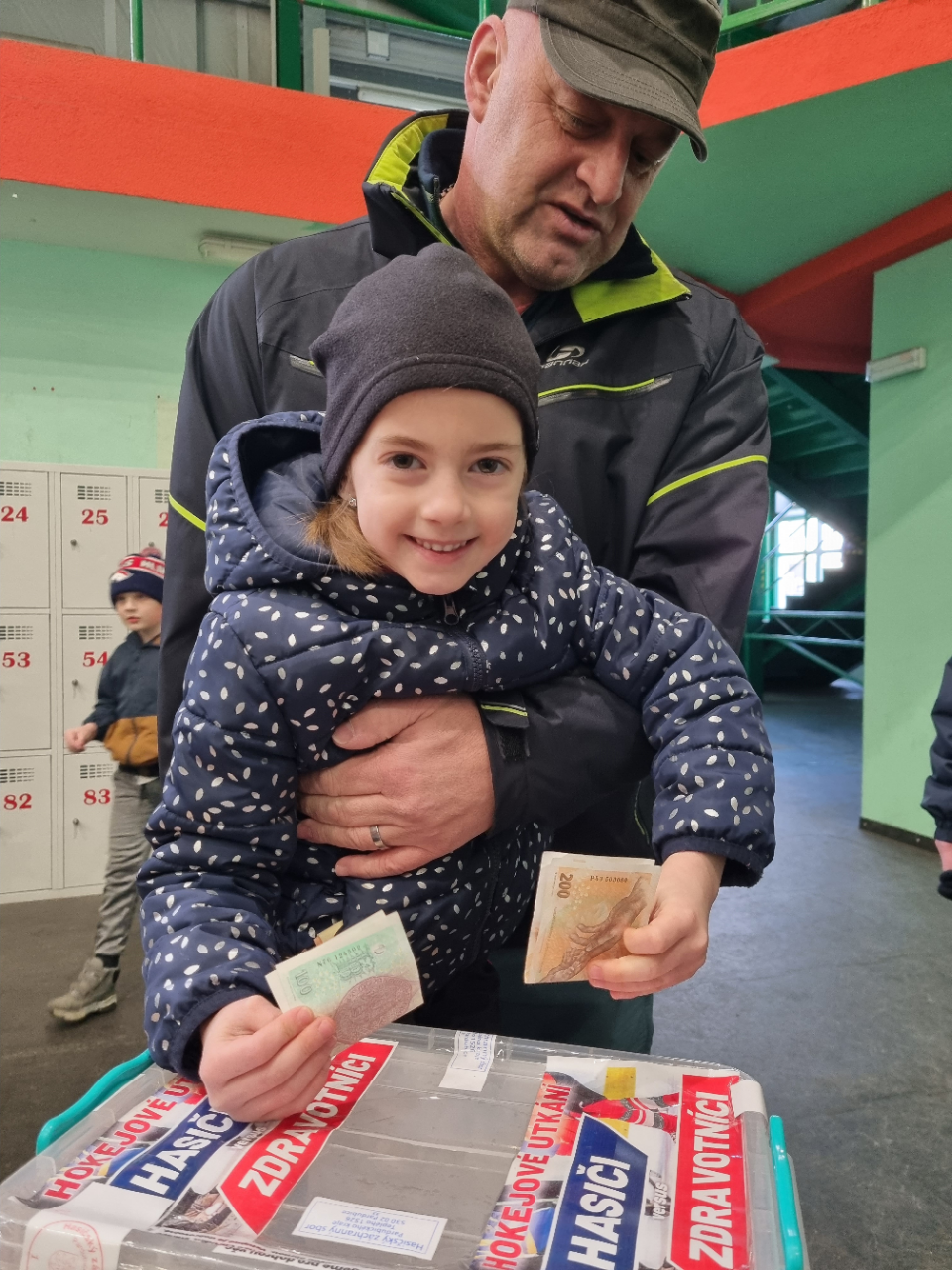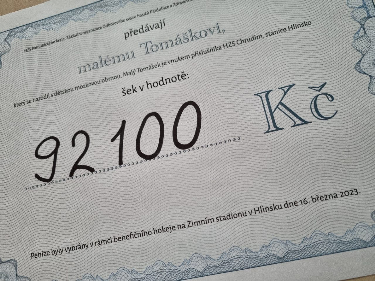 Peníze putovaly malému Tomáškovi, který je vnukem příslušníka HZS Chrudim a slouží na stanici v Hlinsku. Tomášek se narodil s dětskou mozkovou obrnou. Rodiče Tomáška zřídili i účet na domio.cz, kde sbírají peníze pro malého klučinu, který potřebuje nové auto, které je pro něj nezbytné k cestování na rehabilitace a lékařům. Každá koruna se počítá, a tak jsme přispěli i dnešním hokejovým utkáním, a hlavně dobrovolnou sbírkou. Moc dobře víme, že péče o tyto děti je velice náročná a těžce zasahuje do života rodiny postižených dětí. Hasiči tak dnes měli opravdu hřejivý pocit u srdce, že opět můžeme pomáhat.