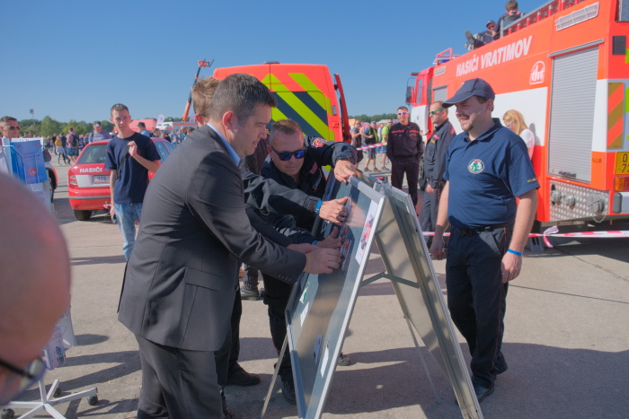 Jan Hamáček také uspěl venku u magnetické tabule, kde měl podle předlohy složit z několika střípků obrázek hasičské cisterny. Odmítl také za správné splnění úkolů jakýkoliv dárek. Preventisté z HZS MSK mu přitom nabídli pexeso s hasičskými vozidly. Chvíli před ním složil obrázek cisterny správně i jeho průvodce, ředitel HZS MSK brig. gen. Vladimír Vlček.