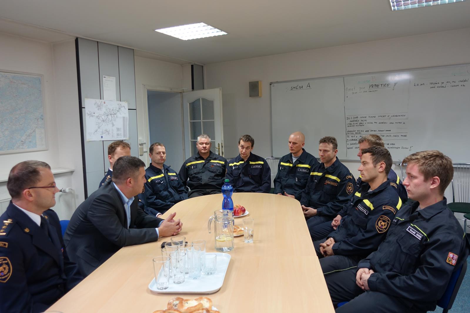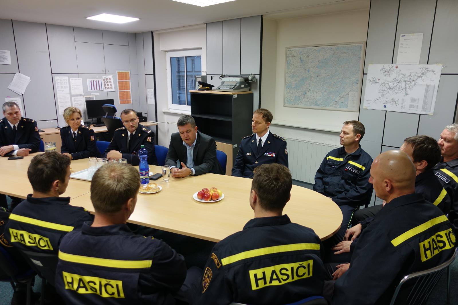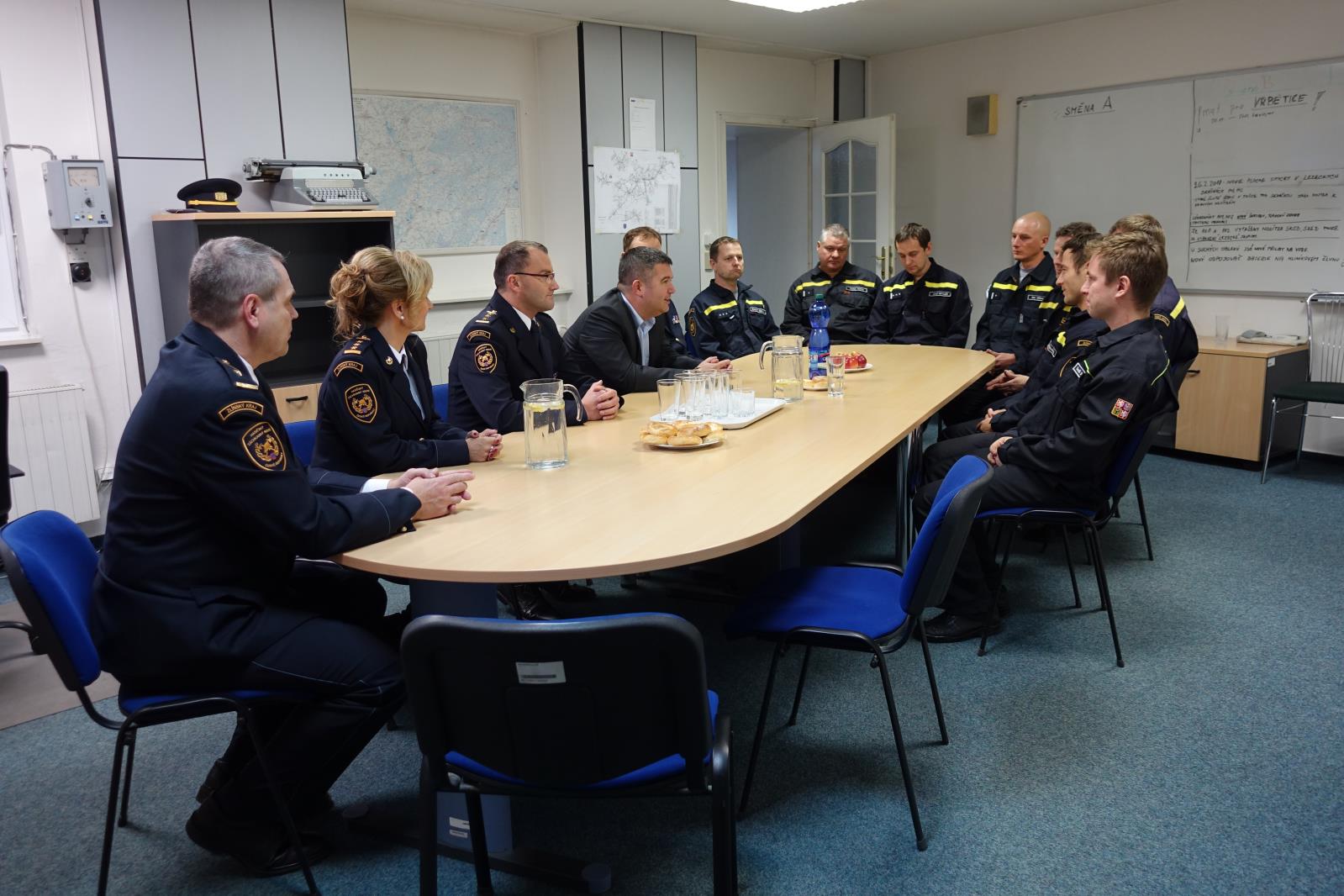 Taktéž zasedl u jednoho stolu s právě sloužící směnou, se kterou diskutoval o požadavcích, vybavenosti a technice výjezdových hasičů. Poděkoval sloužícím příslušníkům za jejich příkladný, obětavý a především profesionální přístup při plnění služebních úkolů.
