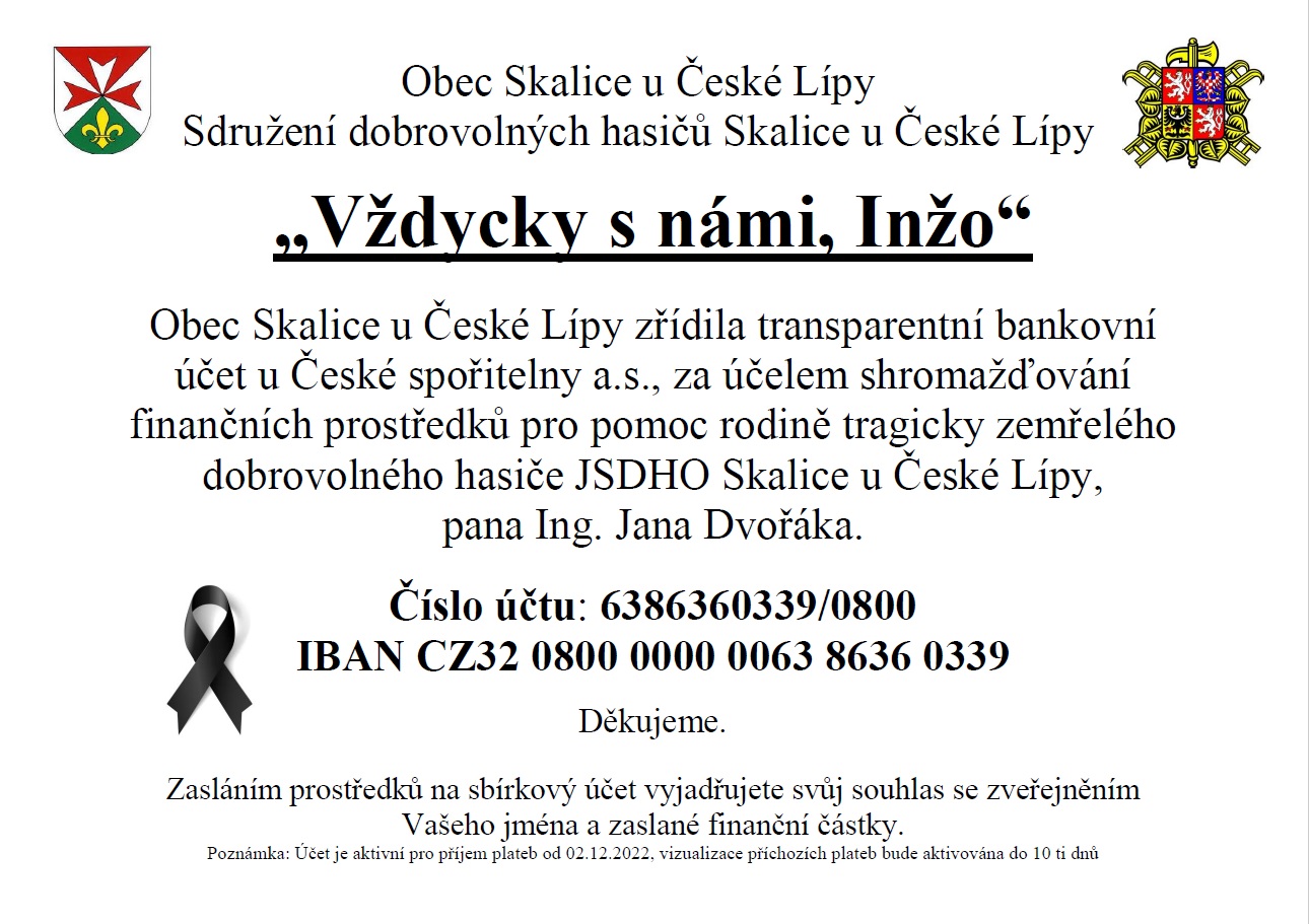 Hasičský záchranný sbor Libereckého kraje informuje o oficiální finanční sbírce pro pomoc rodině zesnulého hasiče JSDH Skalice u České Lípy, kterou zřídila obec Skalice u České Lípy a jednotka Sboru dobrovolných hasičů Skalice u České Lípy. Památku dobrovolného kolegy uctí HZS Libereckého kraje ve středu 7. prosince 2022.