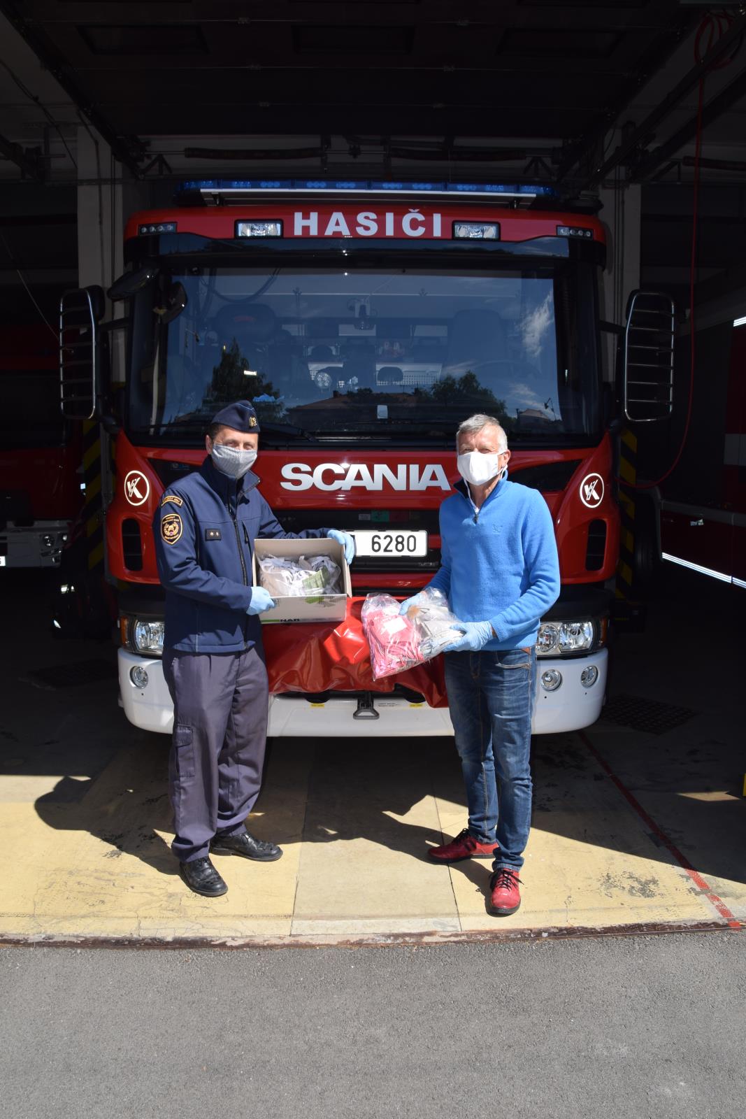 Dva balíky tolik potřebných roušek i 12 litrů dezinfekce přinesl hasičům na stanici do Chrudimi přímo majitel firmy ERA-PACK J. Lörincz.