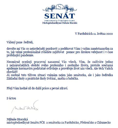 Děkujeme i za milý dopis paní místopředsedkyně Senátu Parlamentu ČR Miluši Horské a její poděkování ještě na hasiče čeká v podobě krásného představení dětí ze školy Svítání.