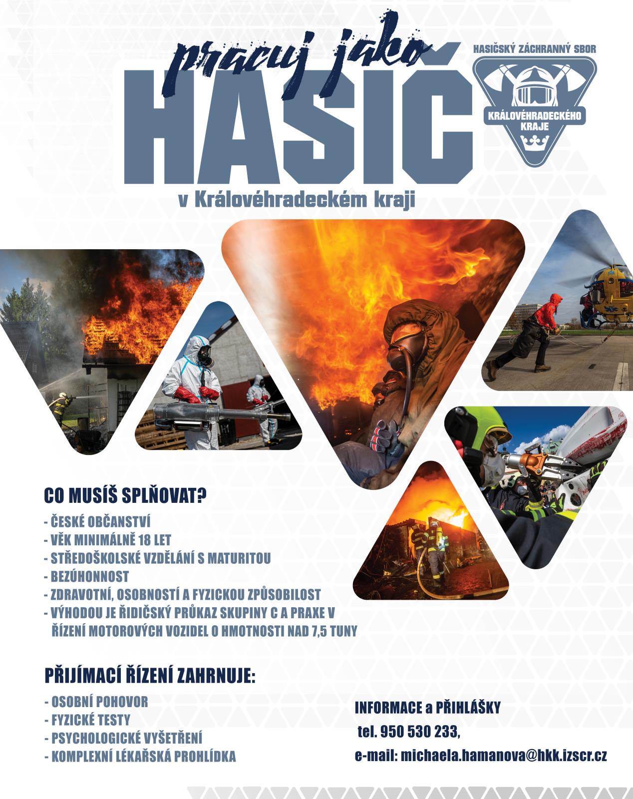 📧 Kontaktujte personální oddělení HZS Královéhradeckého kraje na adrese michaela.hamanova@hkk.izscr.cz, tel. 950 530 233