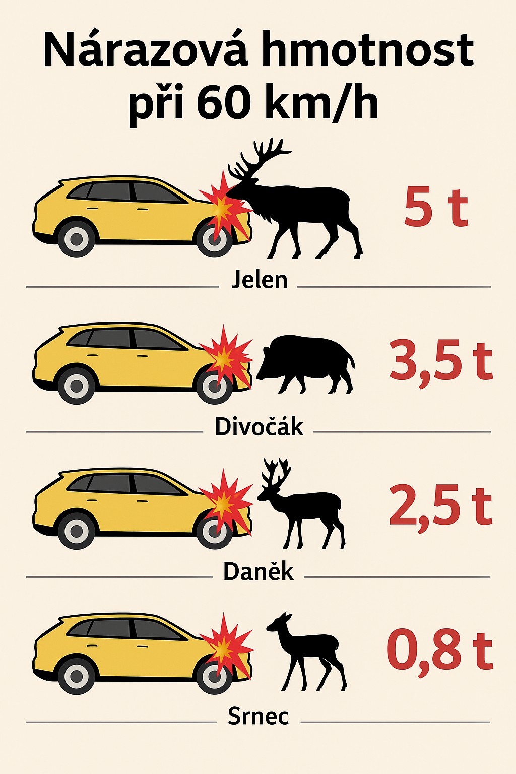 Pokud se střetu nelze vyhnout: držte směr a plynule brzdit. Prudký manévr může způsobit větší nebezpečí. Po nárazu vždy zastavte a zkontrolujte stav vozidla a případně zranění osob. Nezapomeňte neprodleně kontaktovat Policii ČR a poskytnout údaje o místě nehody.