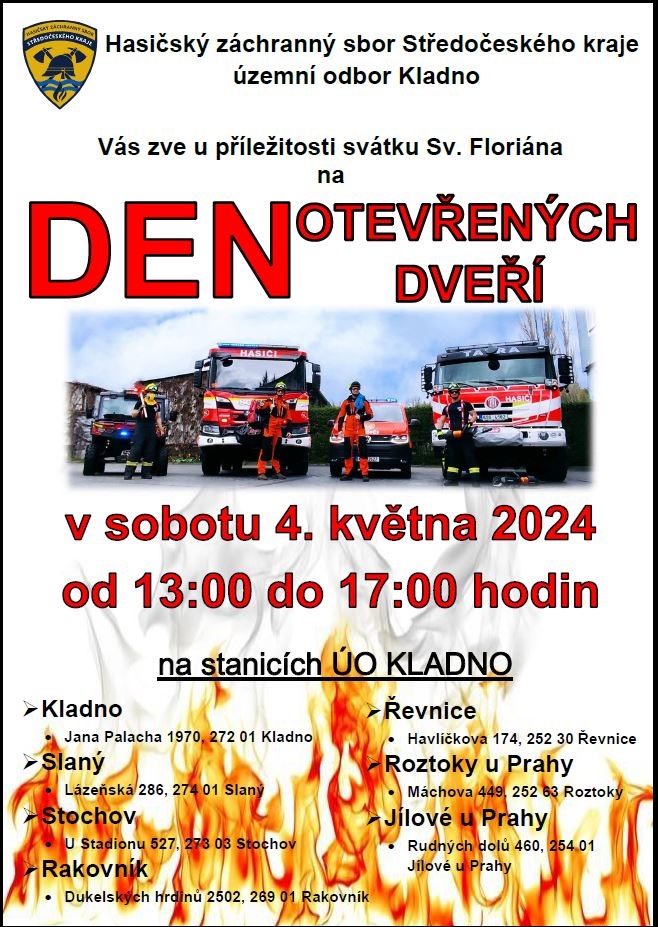 Na den svatého Floriána, který letos připadá na sobotu 4. května, otevřou středočeští hasiči opět některé ze svých stanic pro veřejnost. Návštěvníci tak budou mít možnost nahlédnout do prostor, které jsou jinak veřejnosti zapovězeny. Ne všechny územní odbory naplánovaly návštěvní den právě na sobotu. V některých případech oslaví hasiči svého patrona účastí na akcích spolu s ostatními složkami integrovaného záchranného systému, které mají dlouholetou tradici.