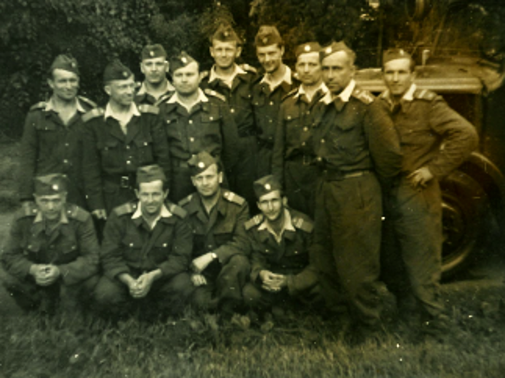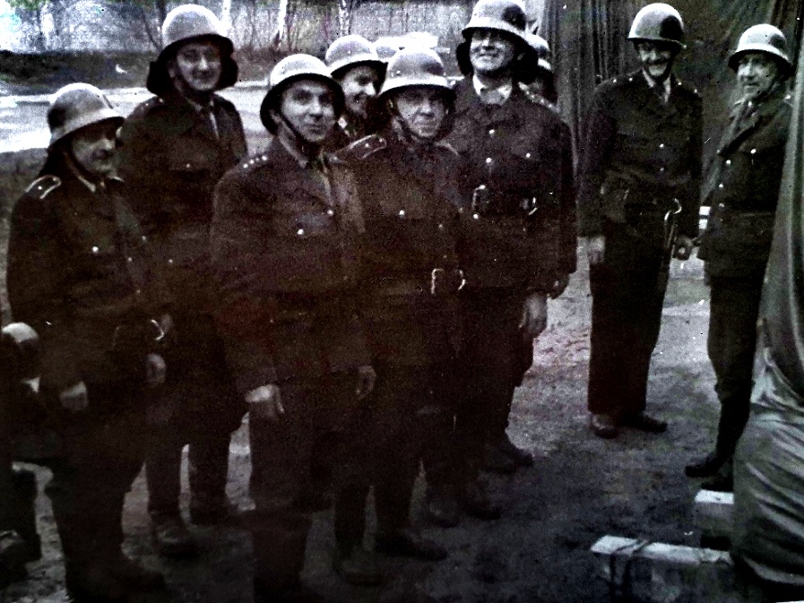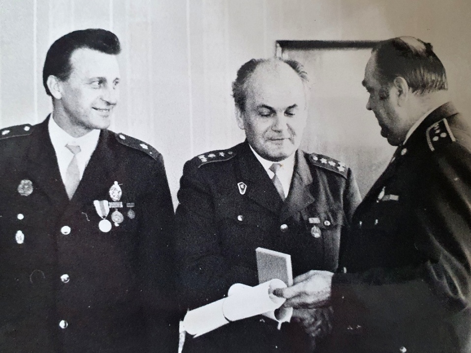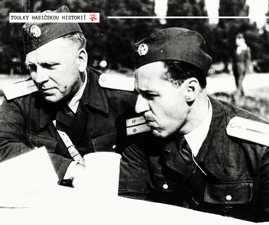 Druhá polovina 50. let, Olomouc - Důstojníci olomouckého hasičského sboru jako velitelé při poradě u zásahu. Podle uniforem a jejich hodnostního označení odhadujeme na dobu po roce 1954 a před rokem 1960, kdy došlo k výrazné změně výložek.
