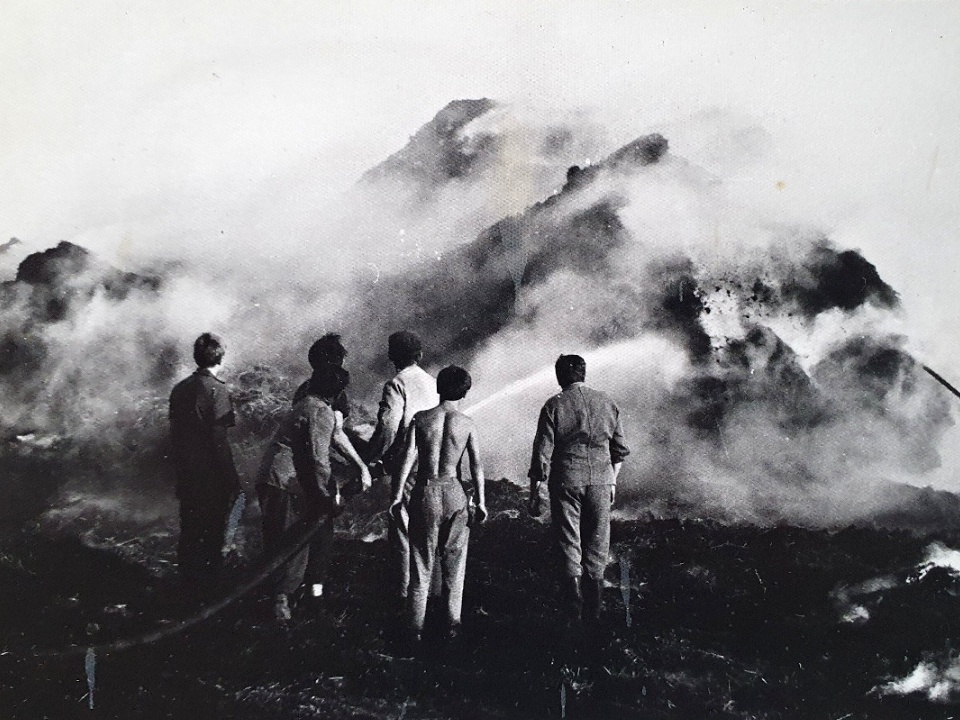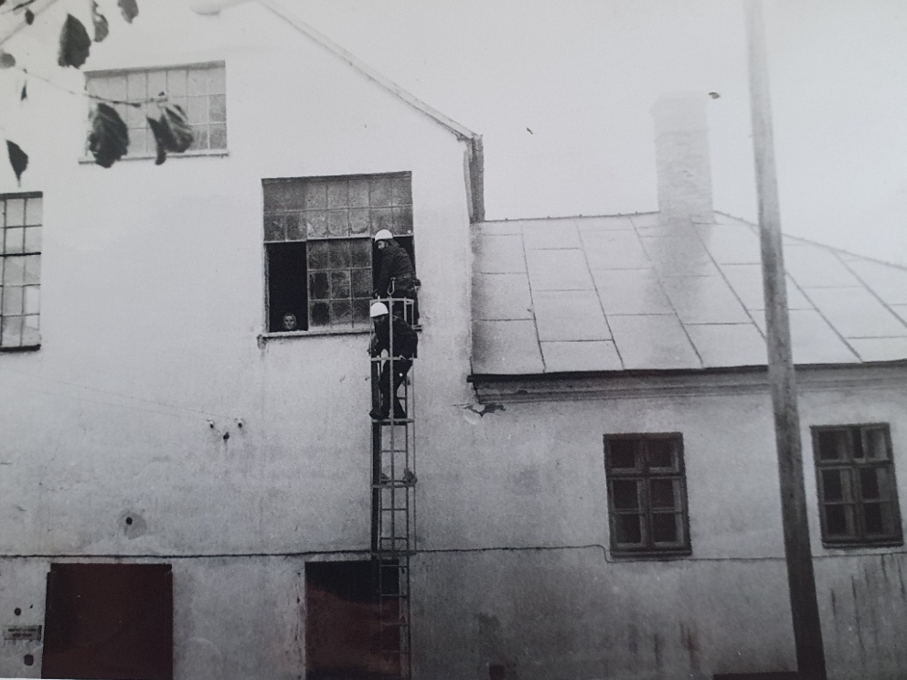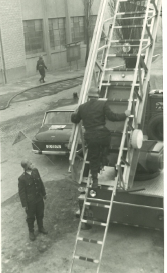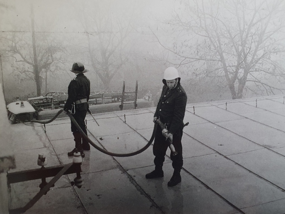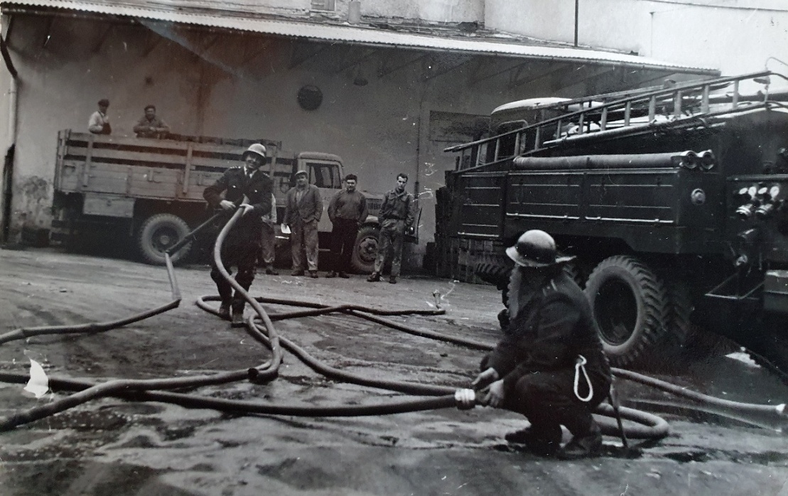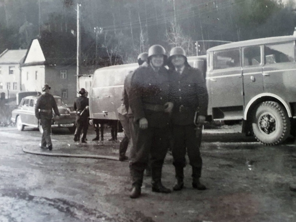 7. 2. 1974, I.P. Pavlova, Olomouc - Požár cisterny s benzínem, který tehdy zkrotily 2 zásahové jednotky hasičů pod velením Stanislava Tichého. Plameny likvidovali za pomocí 8 hasičských vozidel. Na snímku si můžete všimnout i hasičů v zásahových oblecích a přilbách.