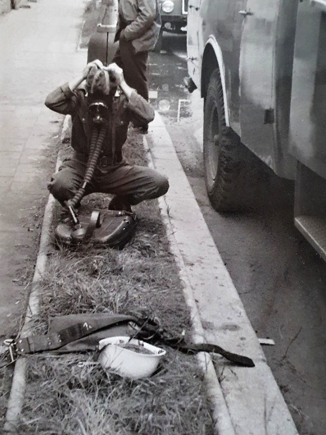 Těsně po revoluci, Schweitzerova ulice, Olomouc - Jednotka výjezdových hasičů již na nové požární stanici, kde sídlí dodnes, v zásahových oděvech s přilbami, rukavicemi a opasky s výzbrojí.