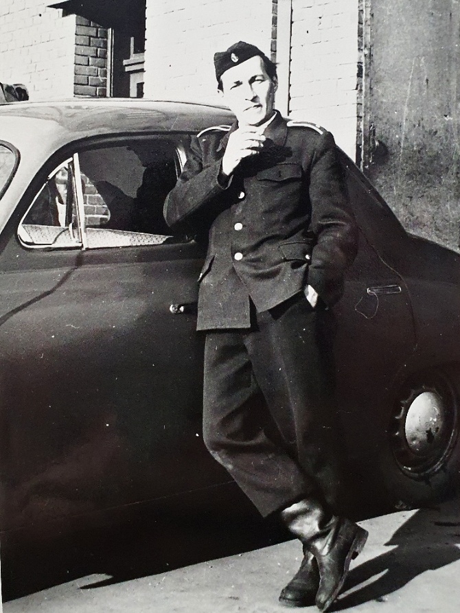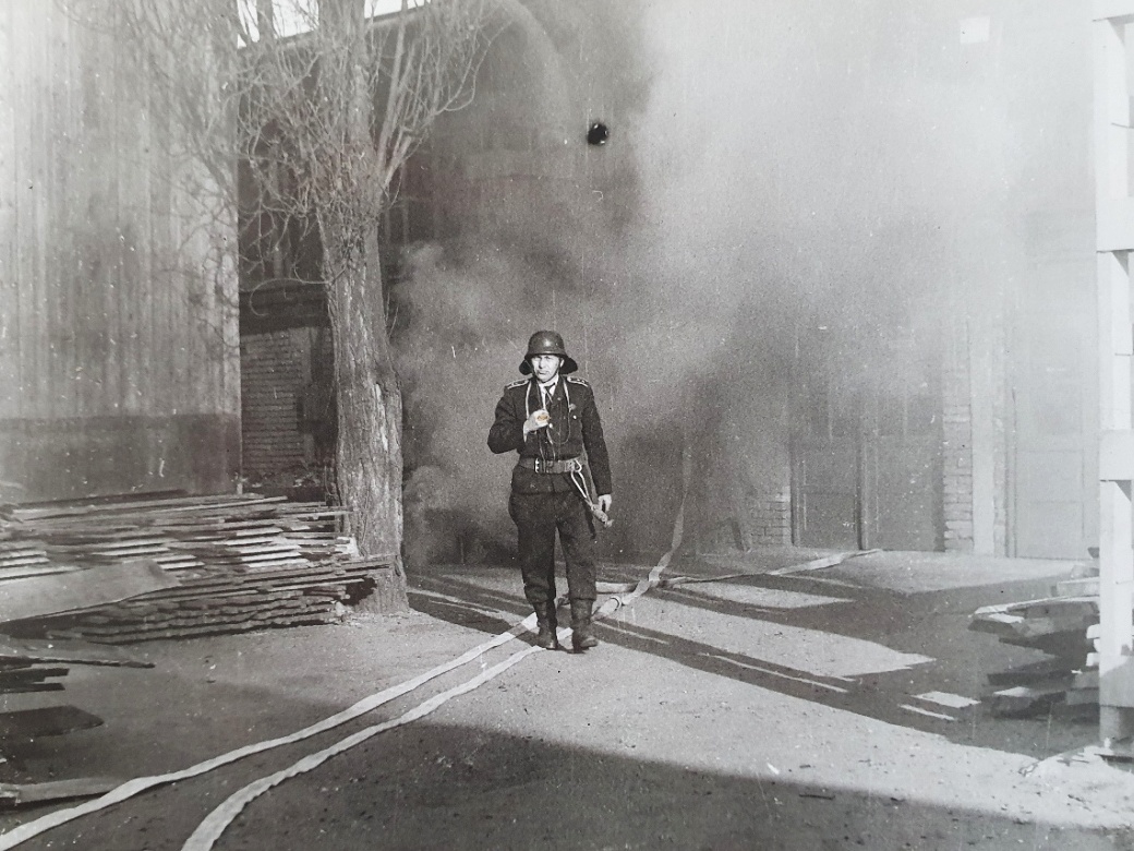 1955, Kateřinská ulice, Olomouc - Nástup olomouckých profesionálních hasičů před stanicí po celostátním vítězství v soutěži požárníků v Brně. V kronice olomoucké směny C kronikář k fotce připsal: „Konečně naši hoši něco dovezli. Vítězství. Přijeli v to pozdní odpoledne roku 1955. Hubení, vážní, usměvaví..." Povšimnout si můžete tehdejších uniforem.