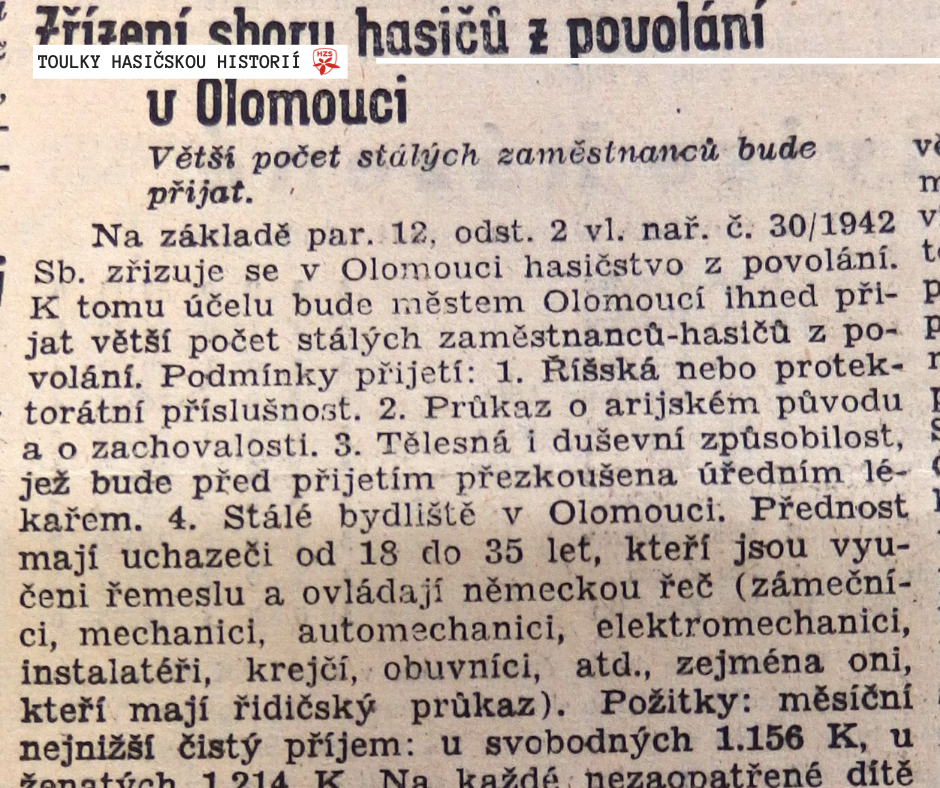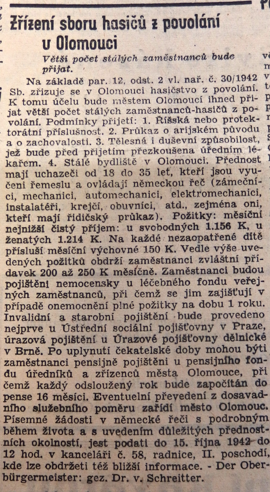 V meziválečném období byl založen olomoucký český dobrovolný sbor, do nějž vstupovali především řemeslníci, dělníci a živnostníci. Během války byl pak založen první profesionální sbor, a i když v něm sloužili převážně Češi, byl pod německým velením. Z této doby také pochází inzerát z úvodní fotografie, kde se dočtete nejen, jakou výplatu si hasiči tehdy ze služby odnášeli, ale také to, že ženatí muži dostávali vyšší plat než ti svobodní, měli též nárok na příspěvky na děti i různé druhy pojištění, například penzijní připojištění. Nejvíce žádaní pro vstup ke sboru byli automechanici, zámečníci, instalatéři, obuvníci, krejčí a ti, kteří vlastnili řidičský průkaz.