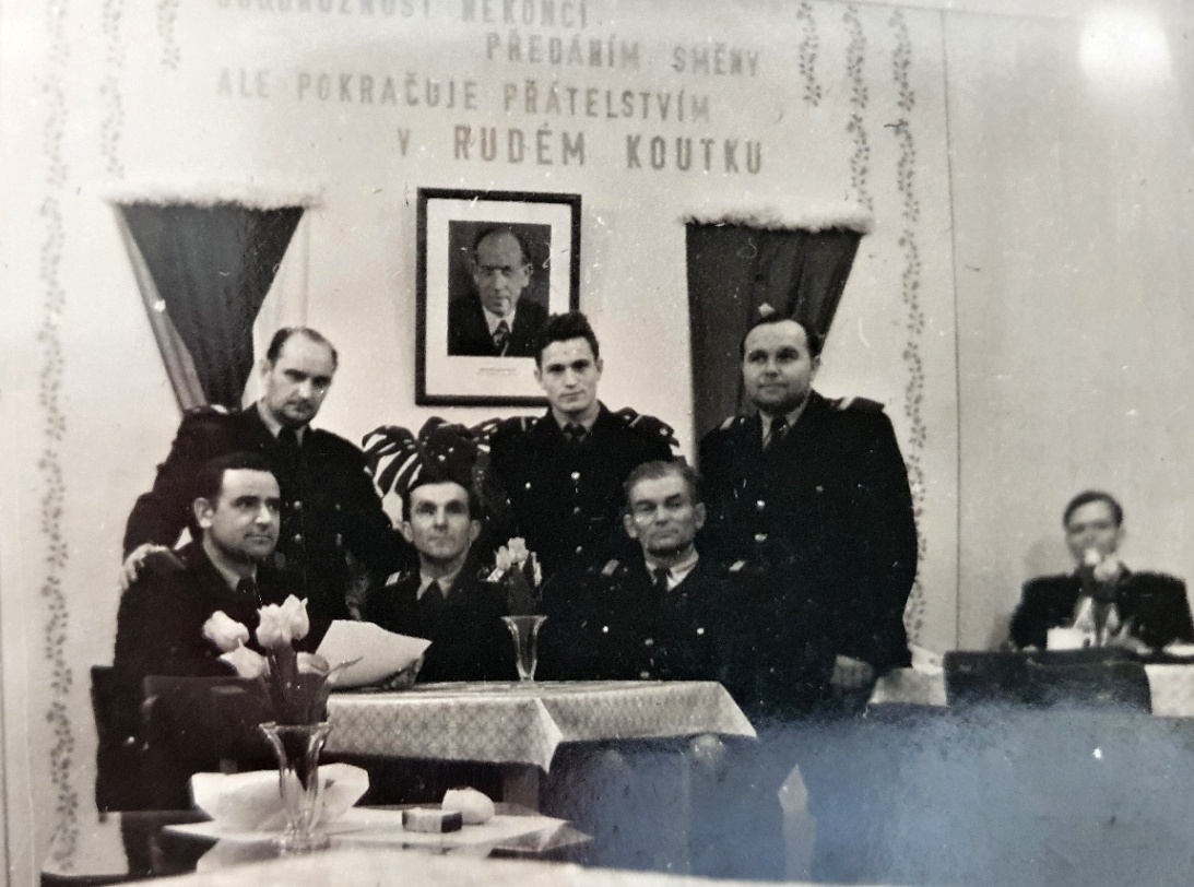 Olomouc, stanice v Kateřinské ulici, 50. léta 20. století - Olomoučtí profesionální hasiči v práci na směně C na vánoční svátky. Vpravo si můžete všimnout vánočního stromečku.
