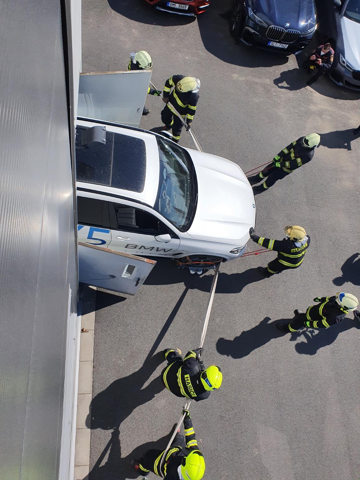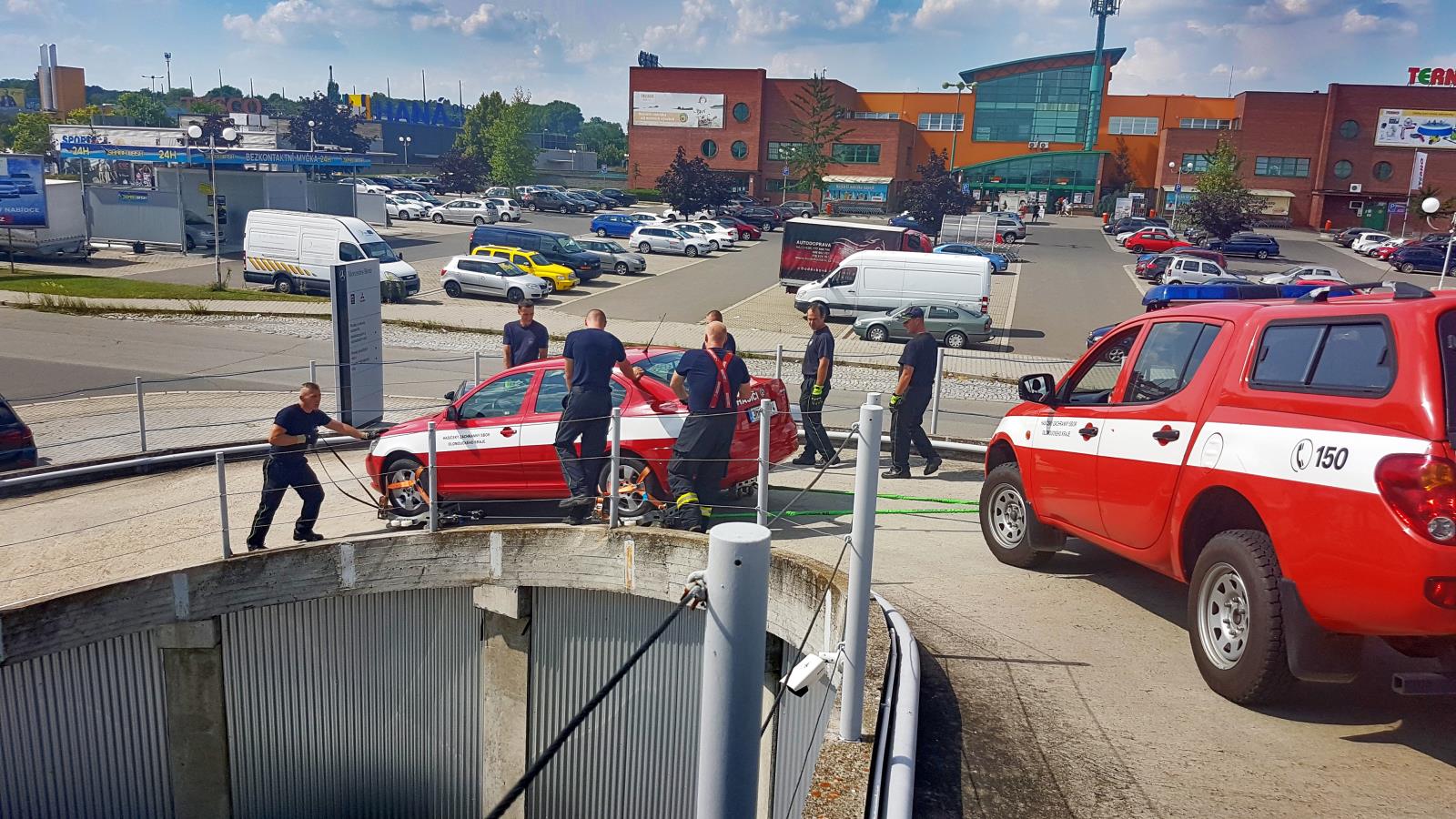 Částečně uhašené vozidlo přesuneme z ohrožených prostor ven. Zde manipulejeme s autem v podzemních garážích Galerie Šantovka