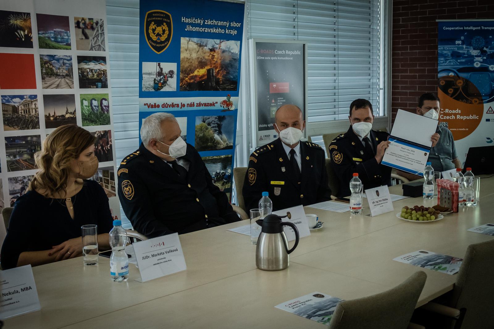 Pátek, 22. října 2021 – Dnes odpoledne jsme na společném setkání s paní primátorkou statutárního města Brna, zástupci Brněnských komunikací a novináři prezentovali naši účast na projektu C-ROADS. Zapojení do projektu bylo oceněno druhým místem v prestižní hasičské anketě.