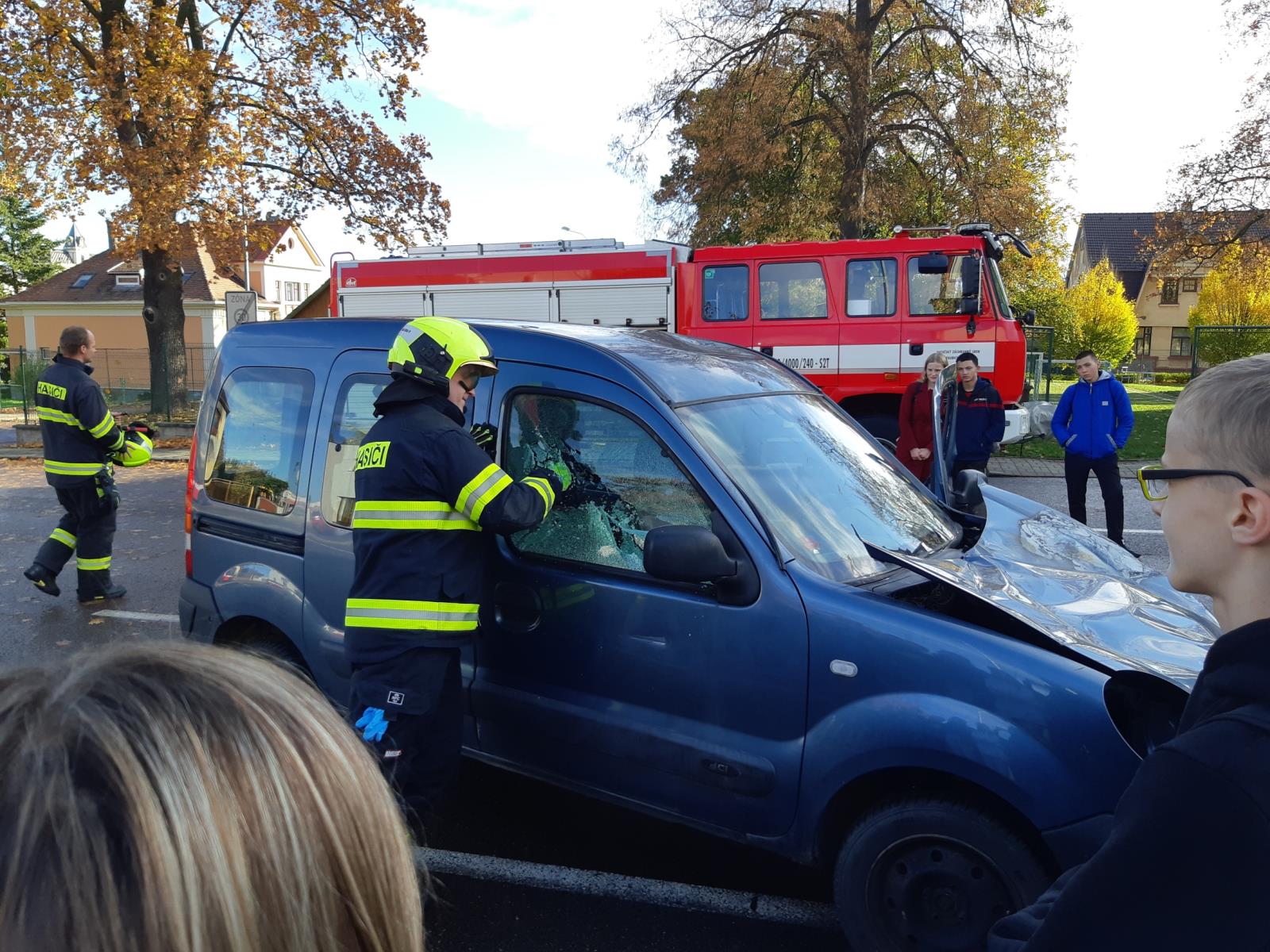 Třešničkou na každoročním povídání je ukázka hasičů – zásah u dopravní nehody a seznámení s činností hasičů a poskytování první pomoci.