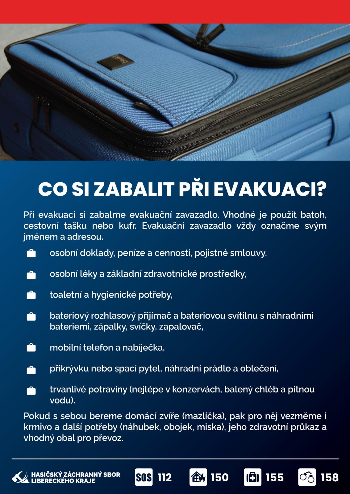 Vezměme si to nejdůležitější, co víme, že budeme potřebovat pro základní přežití po dobu nejméně 3 dnů. Věci sbalme do evakuačního zavazadla. Tím může být batoh, cestovní taška nebo kufr, který označme svým jménem a adresou. Do evakuačního zavazadla určitě zabalme osobní doklady, peníze a cennosti, pojistné smlouvy, osobní léky a základní zdravotnické prostředky, toaletní a hygienické potřeby, bateriový rozhlasový přijímač a bateriovou svítilnu s náhradními bateriemi. Mysleme na věci denní potřeby jako je mobilní telefon a nabíječka. Pro zajištění základních potřeb přibalme přikrývku nebo spací pytel, náhradní prádlo a oblečení, zápalky, svíčky, zapalovač, trvanlivé potraviny (nejlépe v konzervách, balený chléb a pitnou vodu). Pokud s sebou bereme domácího mazlíčka, pak pro něj vezměme i krmivo a další potřeby (náhubek, obojek, miska), jeho zdravotní průkaz a vhodný obal pro převoz.