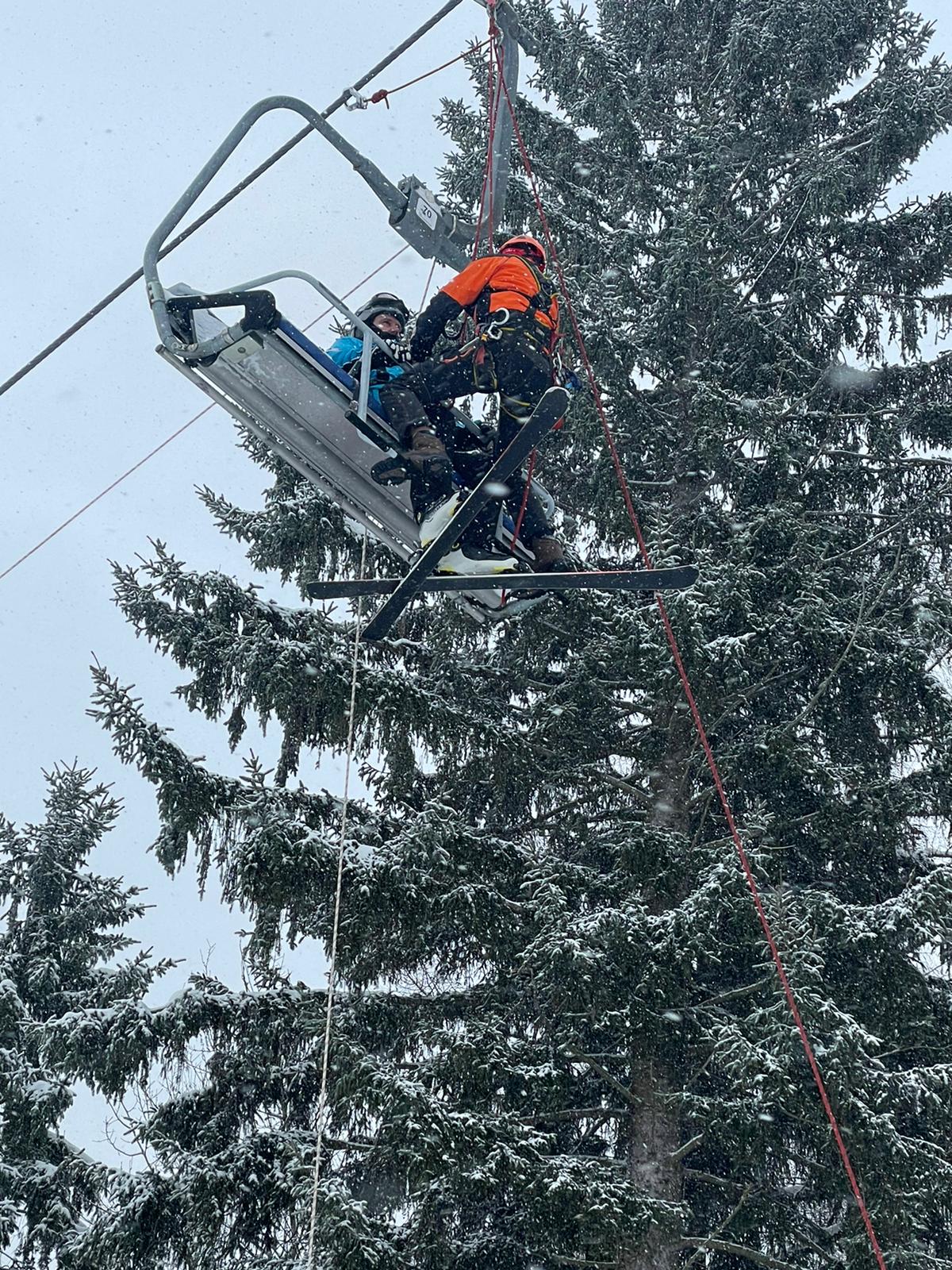 Na místo během pár minut dorazí horští záchranáři nebo hasiči - lezci, specialisté na záchranu z výšky a nad volnou hloubkou. Díky odborné přípravě a lanovým technikám jsou schopni rychle a bezpečně pomoci lyžařům dostat se na pevnou zem. Jeden hasič nahoře zajistí lyžaře do záchranných smyček ještě před odklopením bezpečnostní zábrany. Druhý hasič pak na zem spouští jednotlivé lyžaře. Zásah může mnohdy ztěžovat nízká teplota nebo husté sněžení.