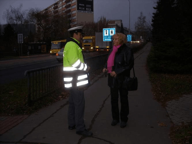 Používání reflexních prvků není pouze doporučením ale zákonnou povinností. Podle zákona o provozu na pozemních komunikacích musí chodec mimo obec za snížené viditelnosti použít reflexní prvek pokud se pohybuje po krajnici nebo okraji vozovky a místo není osvětleno souvislým veřejným osvětlením. Reflexní prvek má být umístěn tak aby byl viditelný ze všech stran například na rukávech nohavicích nebo formou reflexní vesty. Policie upozorňuje že osoba s reflexním prvkem je pro řidiče viditelná až na několikanásobně větší vzdálenost než bez něj. To dává řidiči více času reagovat a může zabránit střetu. Použití mobilního telefonu nebo baterky tuto povinnost nenahrazuje protože světlo není viditelné ze všech směrů. Za porušení povinnosti hrozí pokuta až do výše několika tisíc korun.