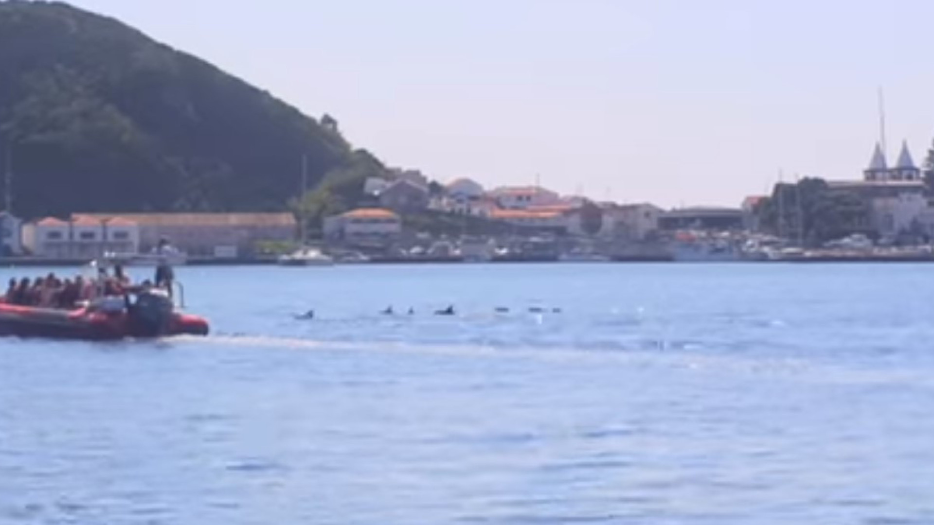 Na snímcích můžete vidět skupinu delfínů klidně plavajících v přístavišti, vedle lodí, které také klidně plují. Přímo před nimi je město Horta, které je "obdivuje".
