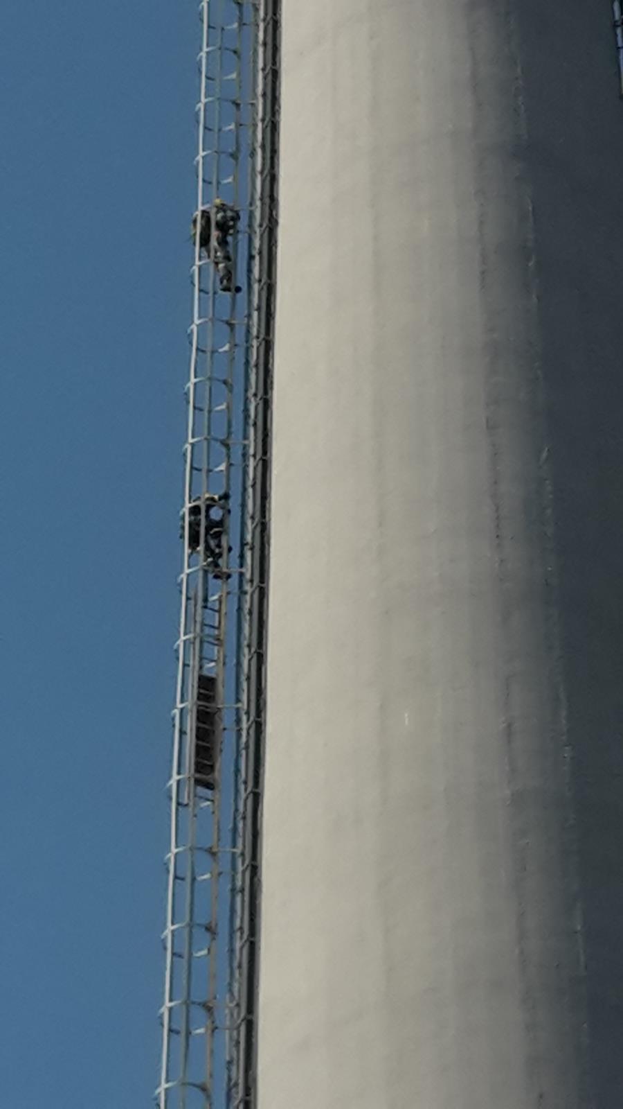 Tři hasiči-lezci vystoupali po vnějším žebříku na 102 metrů vysoký komín. Uvolněné plechy pak rozbrusným zařízením odřezali a zbylé oplechování zajistili. Odřezaněé plechy pak snesli dolů na zem.