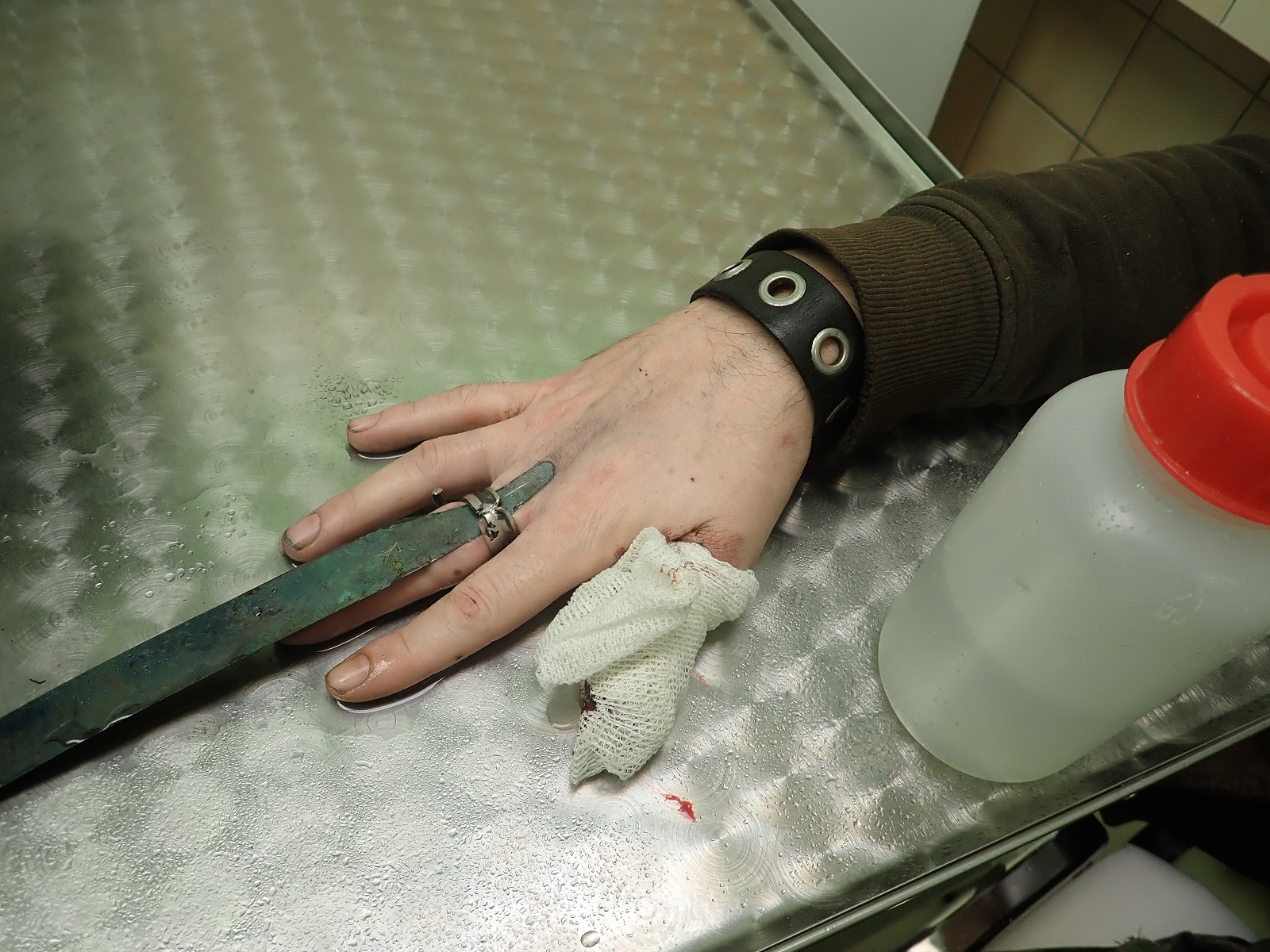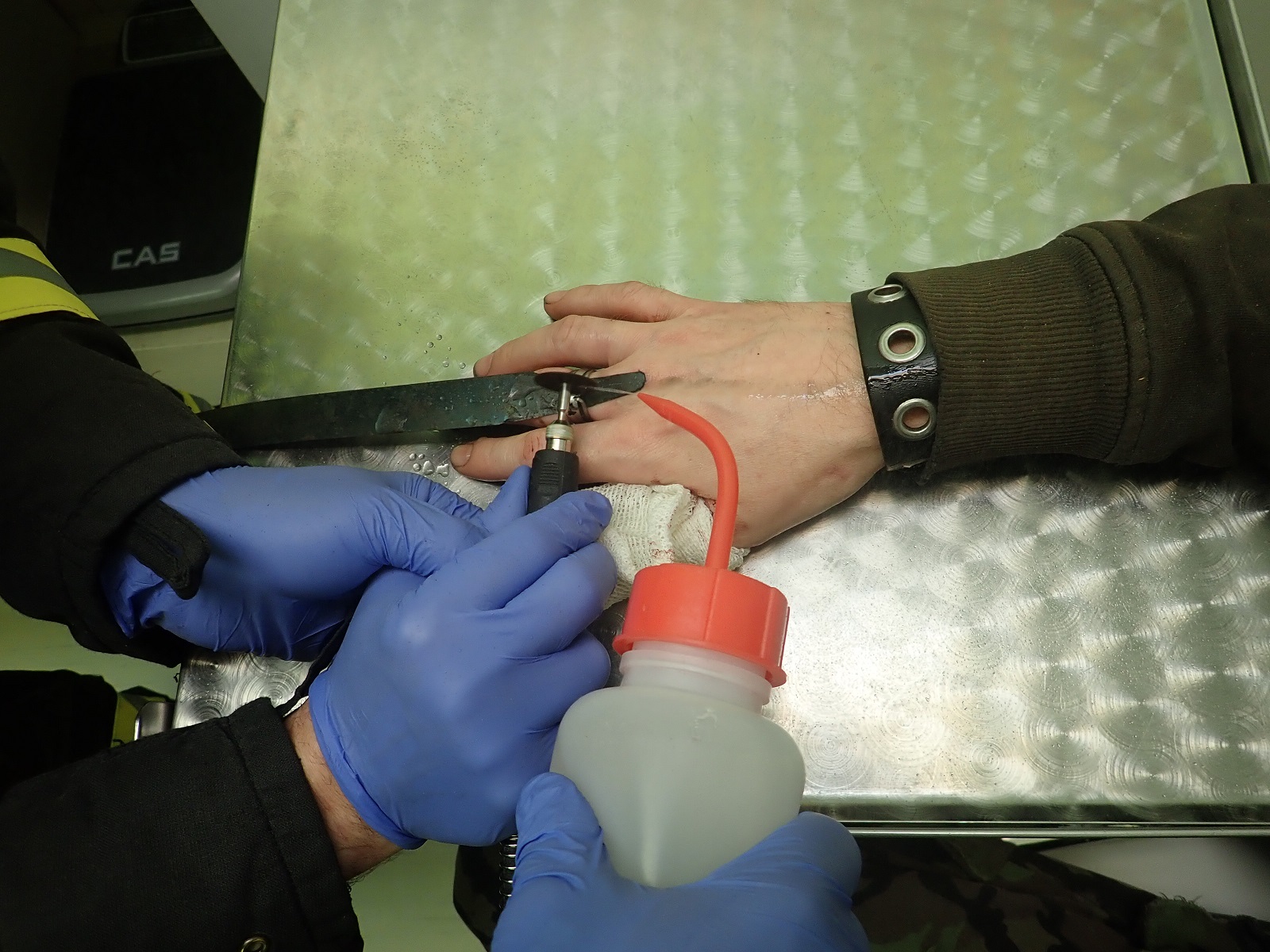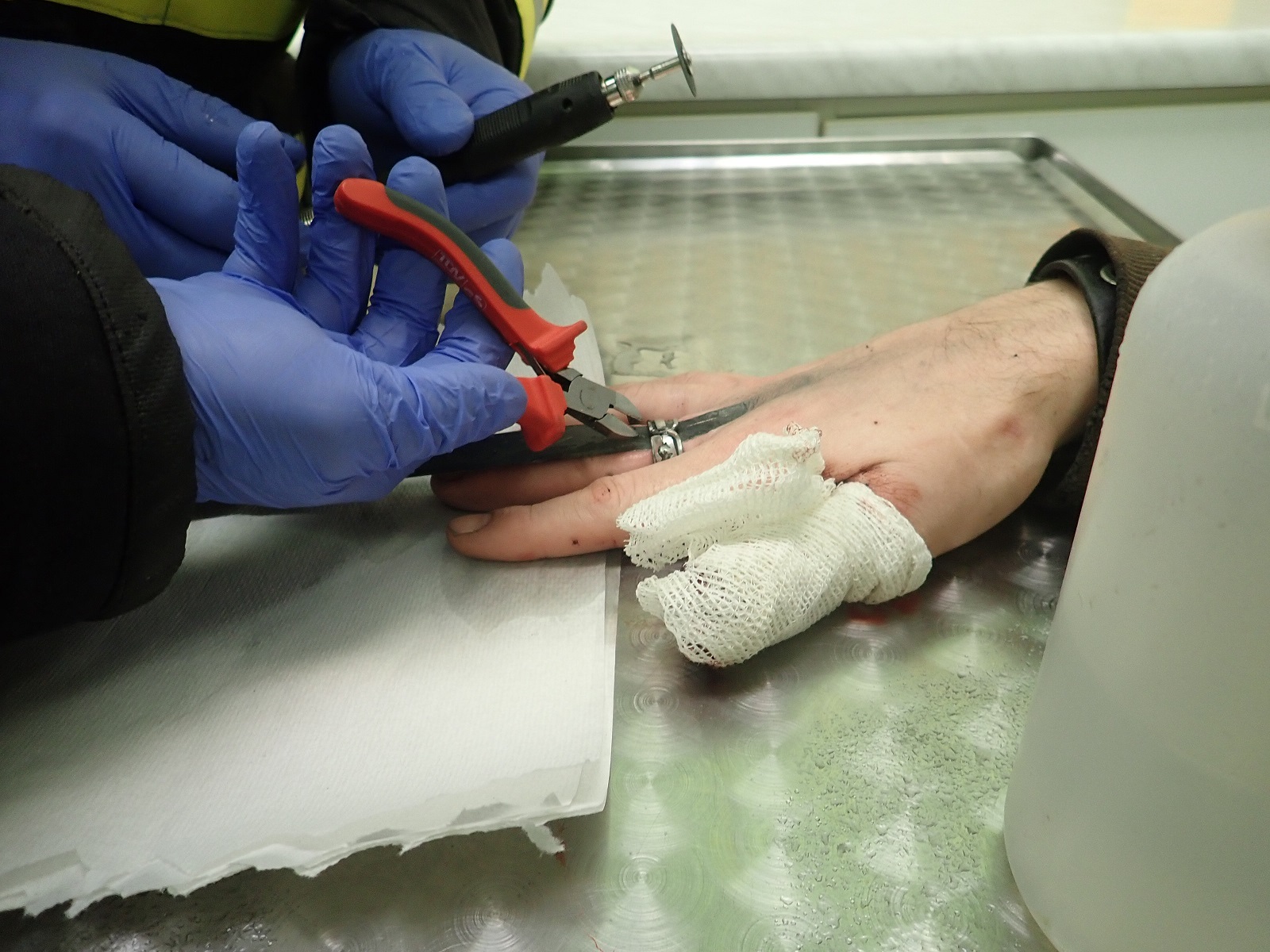 Hasiči zjistili, že prsten má po předchozím pokusu o odstranění vytvořenu ostrou hranu. Nemohli tak k sundání použít provázek. Mezi prst a prsten proto vložili pro ochranu kus plechu. K naříznutí prstenu použili multifunkční nářadí s malým rozbrušovacím kotoučem. Při řezání museli prsten chladit destilovanou vodou. Po dostatečném oslabení materiálu prsten odstranili s pomocí štípacích kleští.
