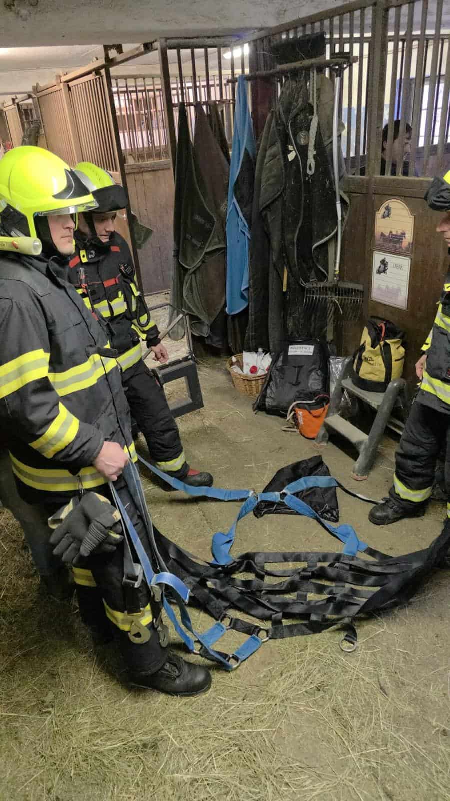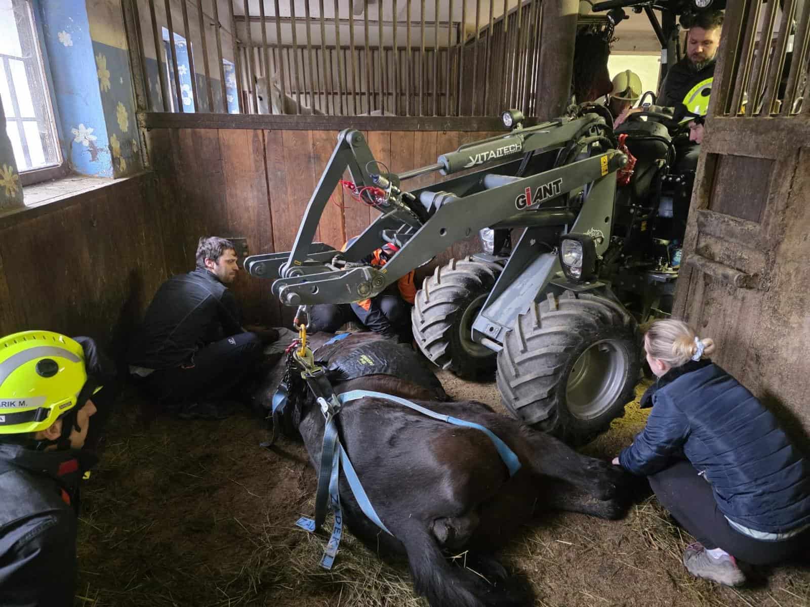 Hasiči klisnu opatrně zajistili do záchranné sítě a pomocí techniky ji postupně a velmi citlivě zvedli zpět na nohy. Celý zásah probíhal pod dohledem veterinářky, která kontrolovala zdravotní stav zvířete a dohlížela na bezpečný postup.