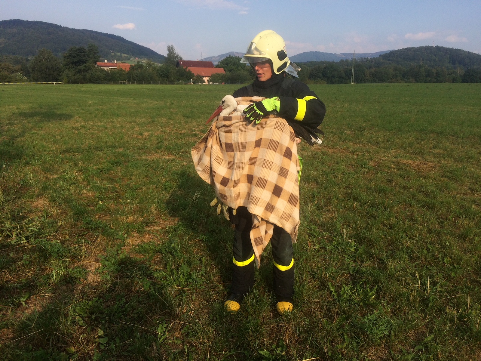 Šikovní hasiči využili dvojici nastavovacích žebříků ze zásahového automobilu, čápa opatrně uchopili do deky a vynesli ven, kde jej vypustili zpět do přírody.